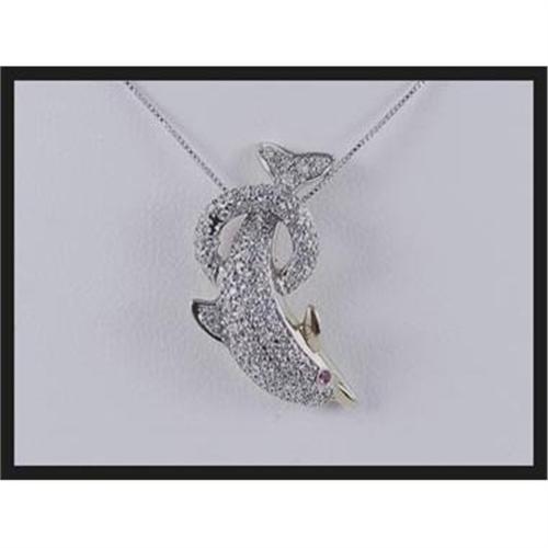 Unique dolphin charm with 73 diamonds that weigh 0.22 carats and 1 ruby that weighs 0.01 carat set in 14K yellow gold. The charm measures 13 millimeters (1/2 inches) wide x 22 millimeters (7/8 inches) long and weighs 3.14 grams total weight.