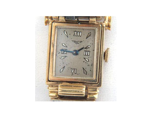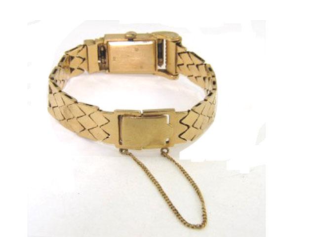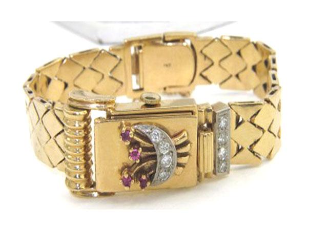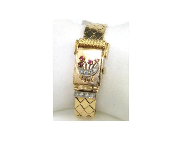 14K Yellow Gold Diamond & Ruby Watch. The total watch's weight is 51.6 grams. The total weight of diamond: 0.56 cts.,approximately. H color VS clarity. The total weight of ruby: 0.2 cts. approximately. The measurements of watch head is 25 x 15 mm and 6 mm thick. The length of watch: 7". swiss made. Water Resistant. Chain is 11 mm wide.
