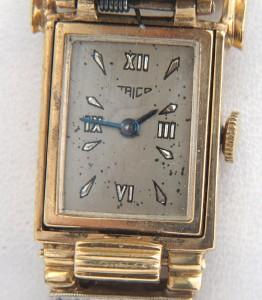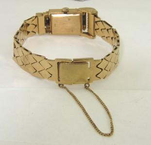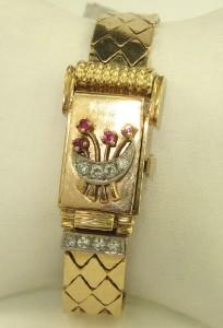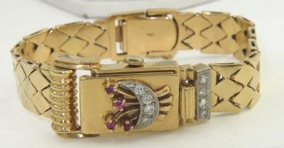 14K Yellow Gold Diamond & Ruby Watch. The total watch's weight is 51.6 grams. The total weight of diamond: 0.56 cts.,approximately. H color VS clarity. The total weight of ruby: 0.2 cts. approximately. The measurements of watch head is 25 x 15 mm and 6 mm thick. The length of watch: 7". swiss made. Water Resistant. Chain is 11 mm wide.