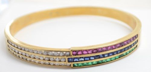 14K Yellow Gold Diamond, Ruby, Sapphire, & Emerald hinged bangle ,safety clasp