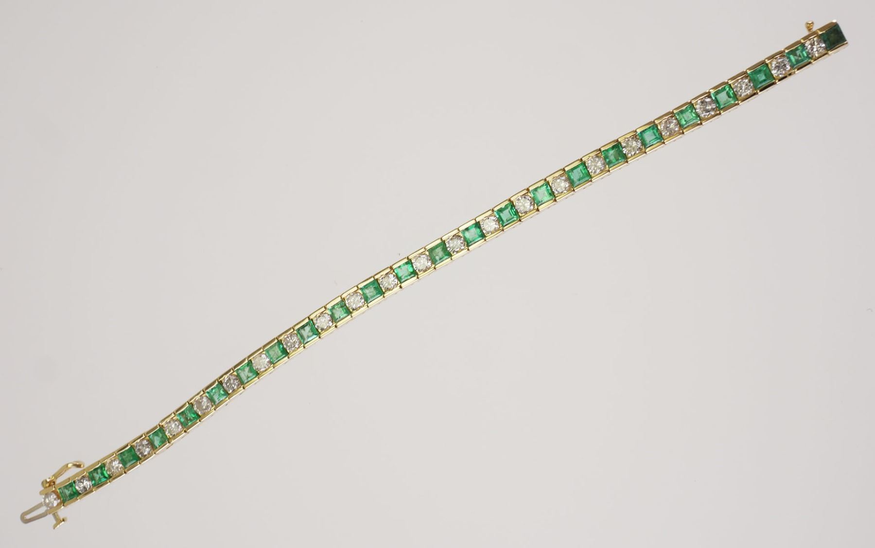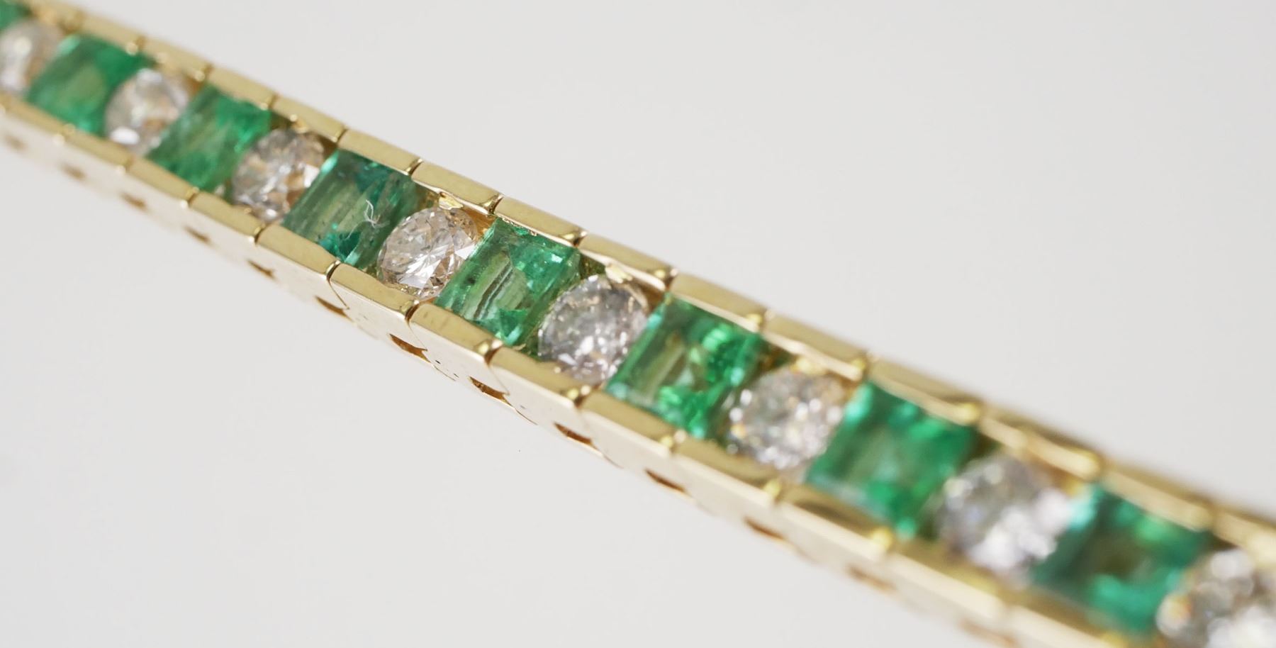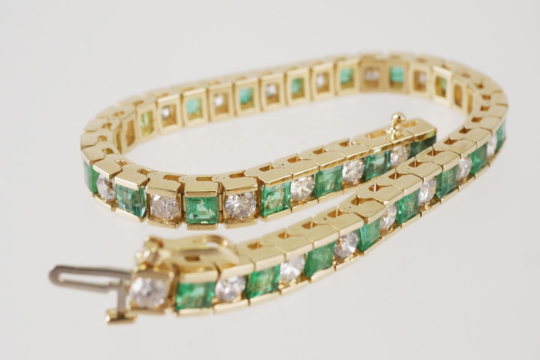 14K yellow gold bracelet with 5.10 carats of E cut Columbian emeralds & 3.77 carats SI round diamonds. Bracelet measures 7" in length, overall weight is 22.1 grams. Good condition with normal wear, see photos for more details on condition. (16)