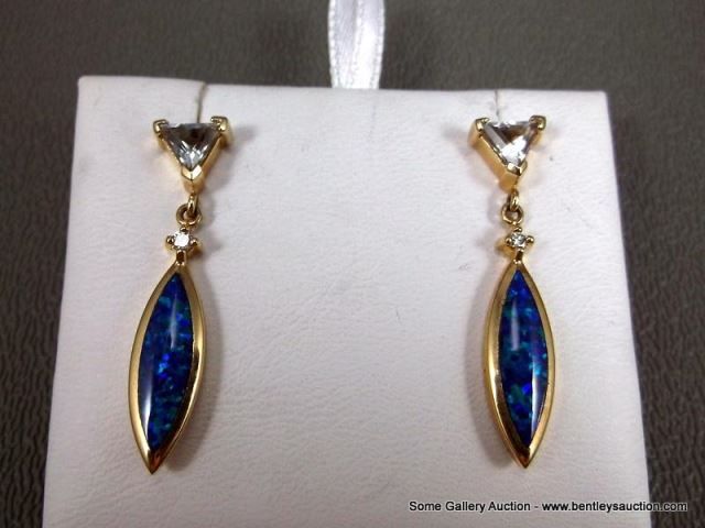 14K Yellow Gold Earrings w/ Opal, Diamond and Bluish Stones-Marked w/ Double Loop Weight: 5.4 Grams