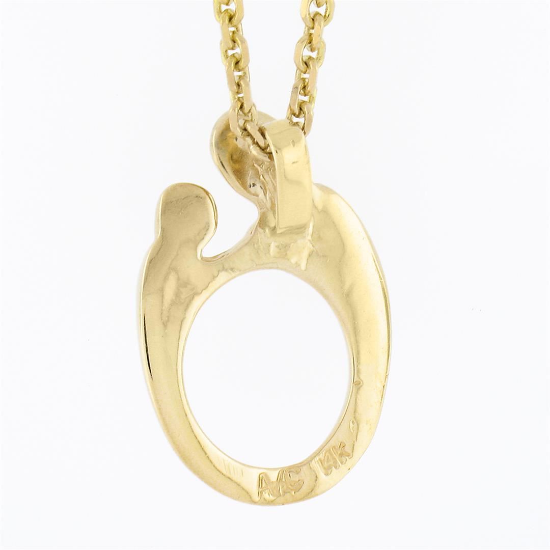 A solid 14k yellow gold mother child pendant necklace. The pendant weighs a total of 11.0 grams, measures 24.50mx16.60mm including the bail, and 18.5 inch cable link chain.