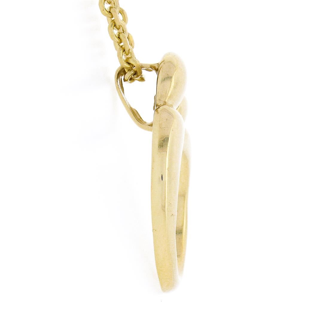 A solid 14k yellow gold mother child pendant necklace. The pendant weighs a total of 11.0 grams, measures 24.50mx16.60mm including the bail, and 18.5 inch cable link chain.