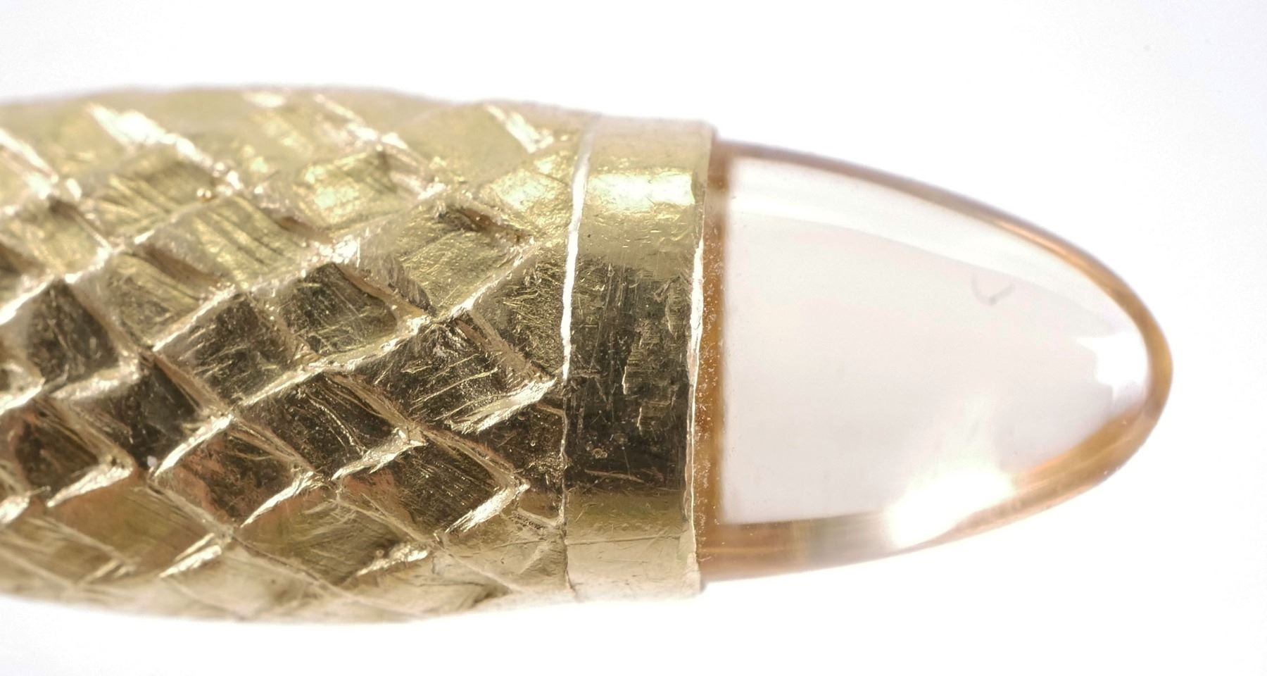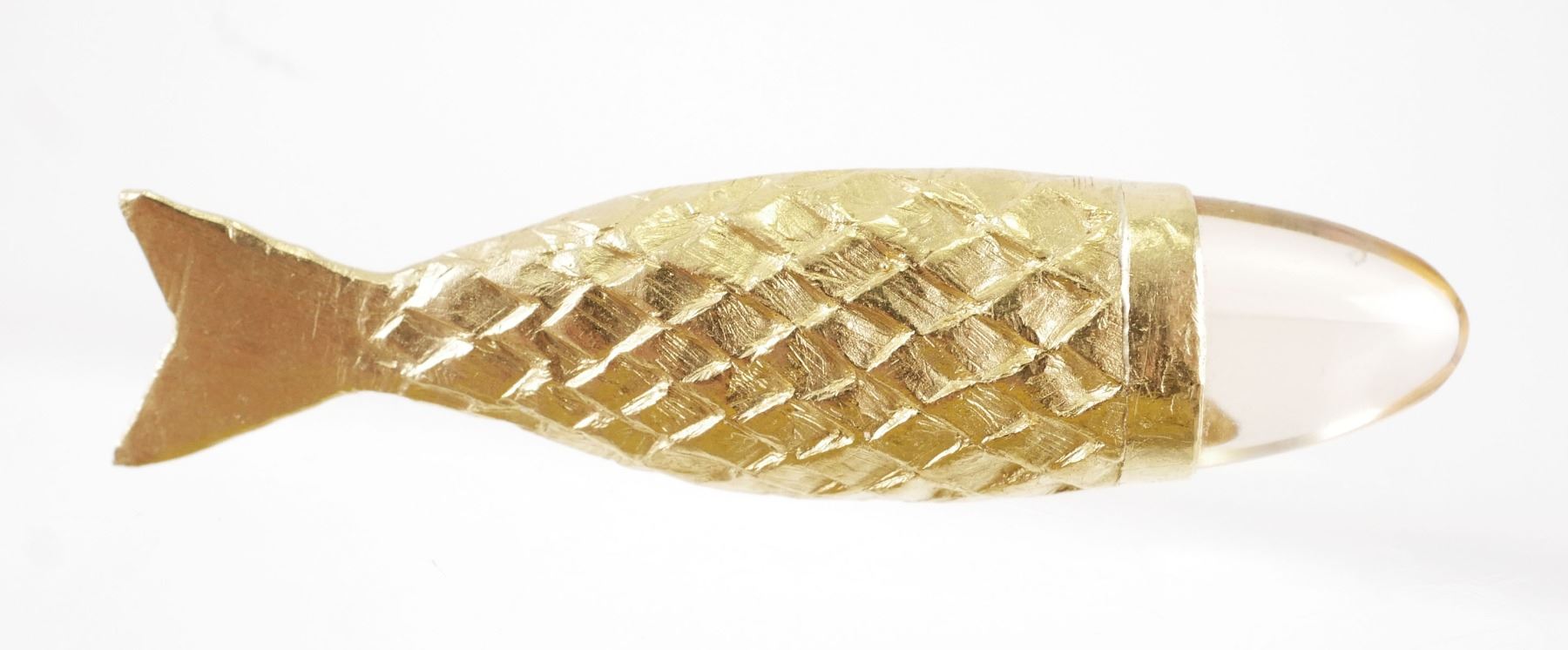 14K yellow gold fish pin or brooch with clear head. 1 1/2" in length, 4.6 grams. Good condition with normal wear, see photos for more details on condition.
