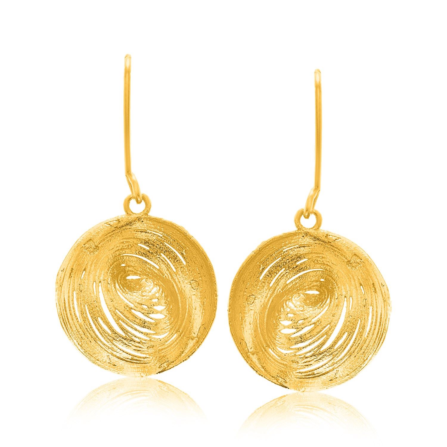 The unique round clam shell inspired design of these dangling earrings is highlighted by the intricate lace detailing. Crafted in fine 14K yellow gold.