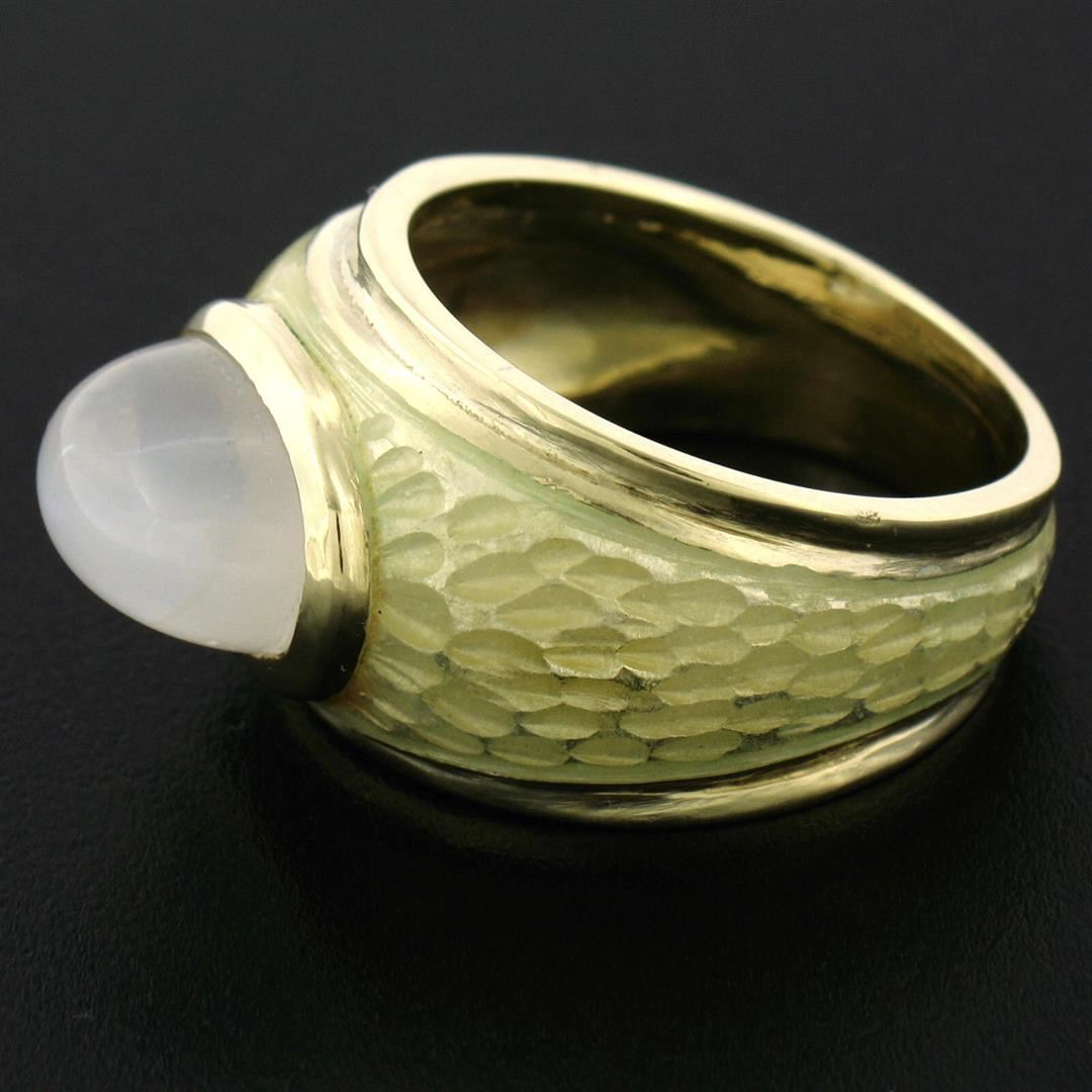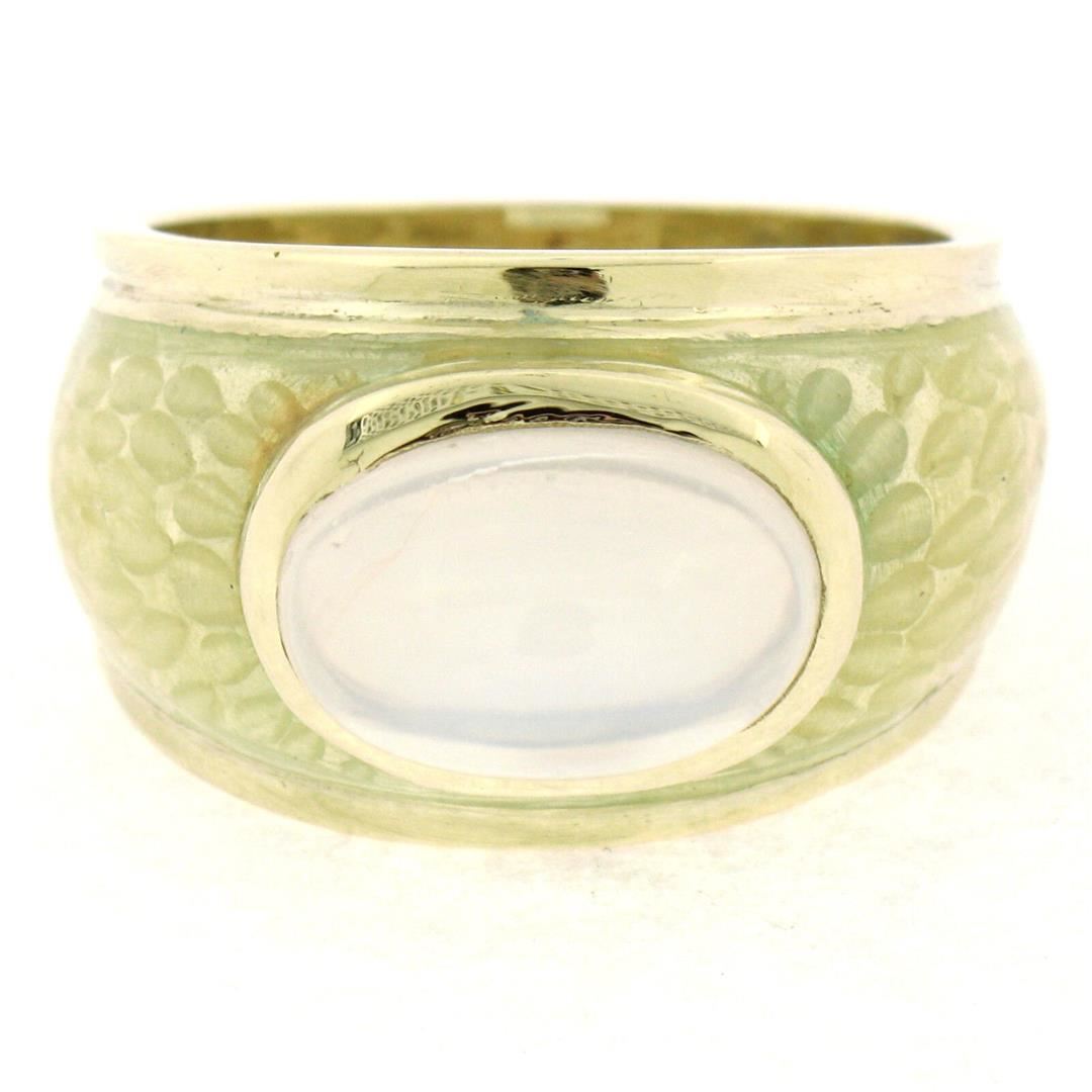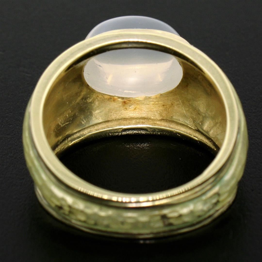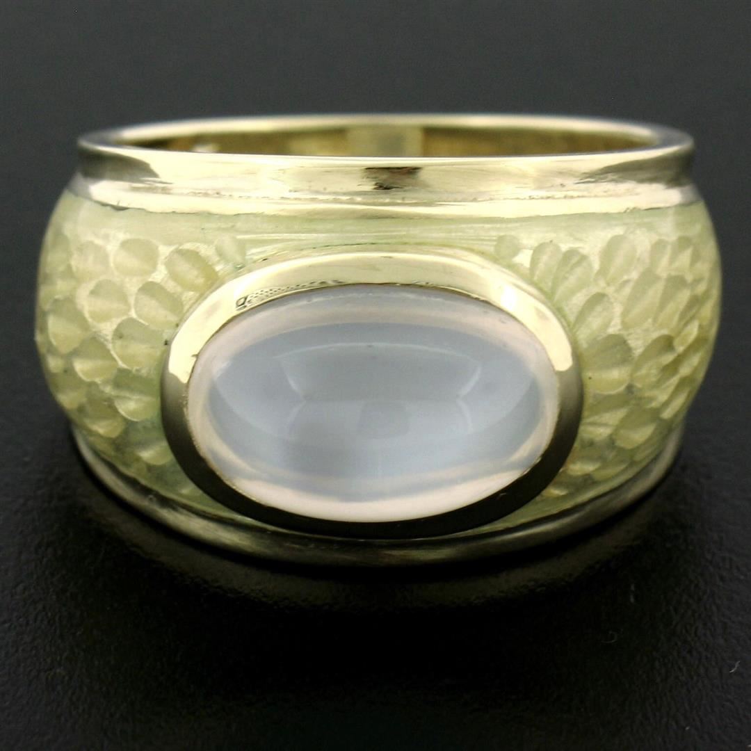 An estate solid 14k yellow gold wide band ring, with 1 oval cabochon cut natural moonstone (11.75x7.6mm; 4.31ct). The ring is size 8.0, weighs a total of 11.65 grams, and measures 13.85mm wide.