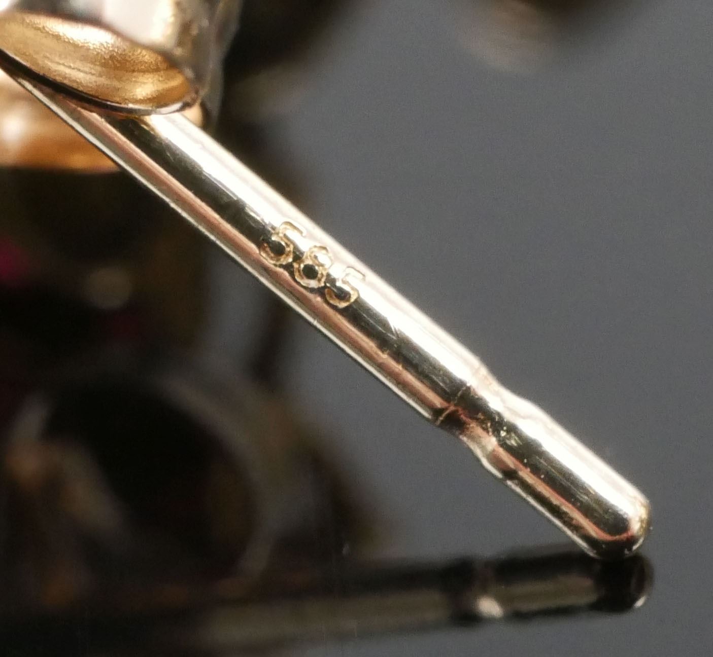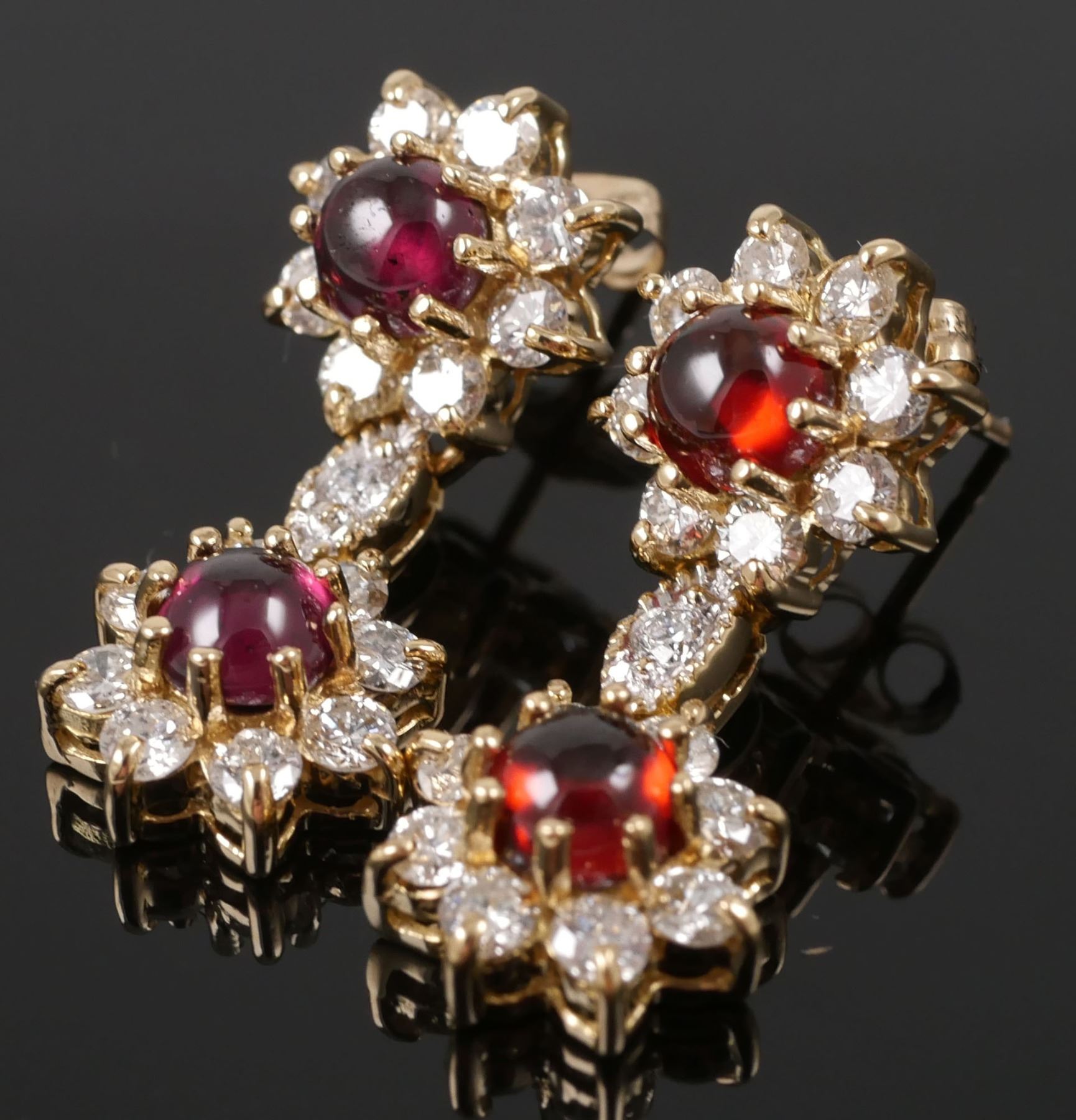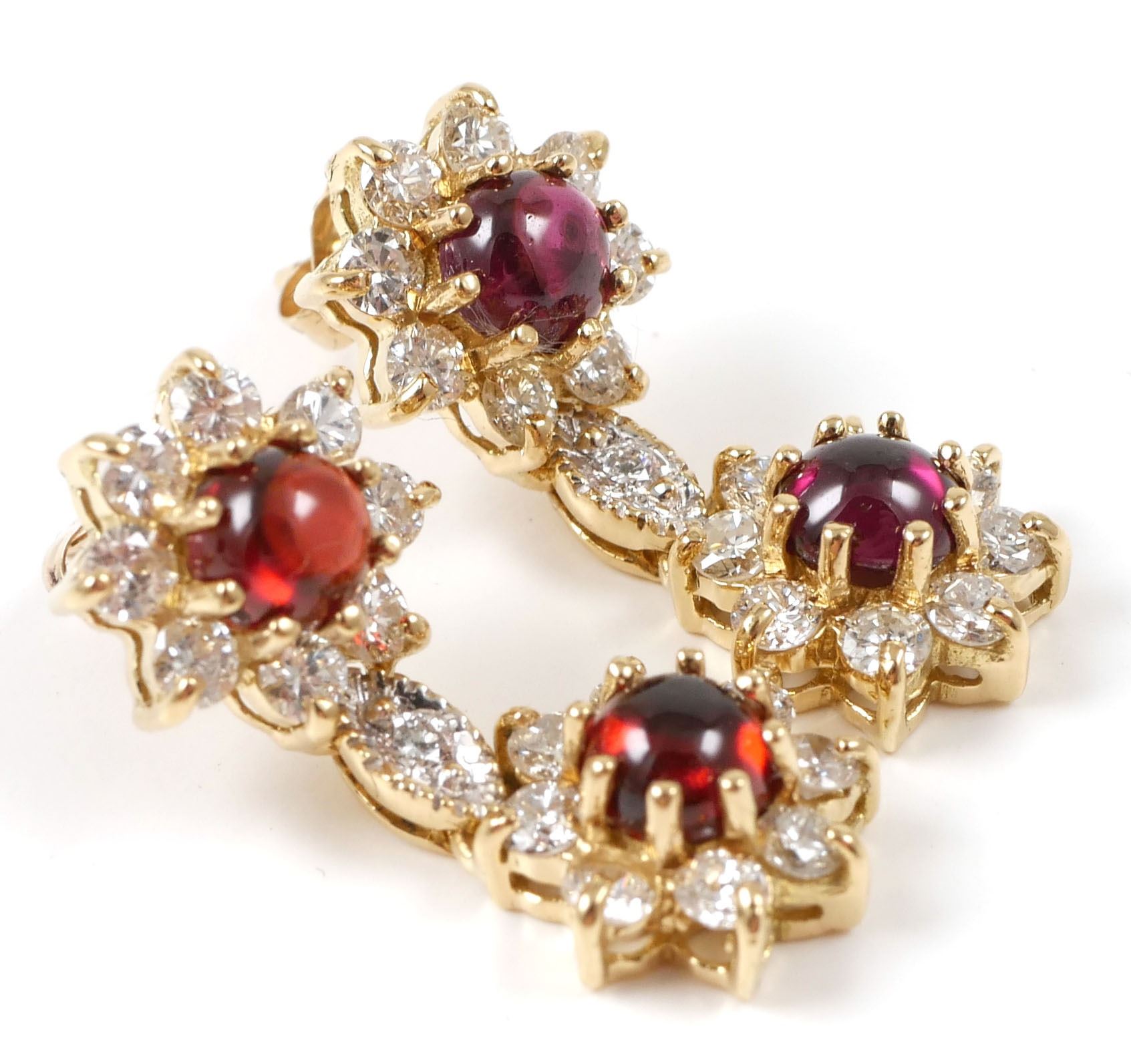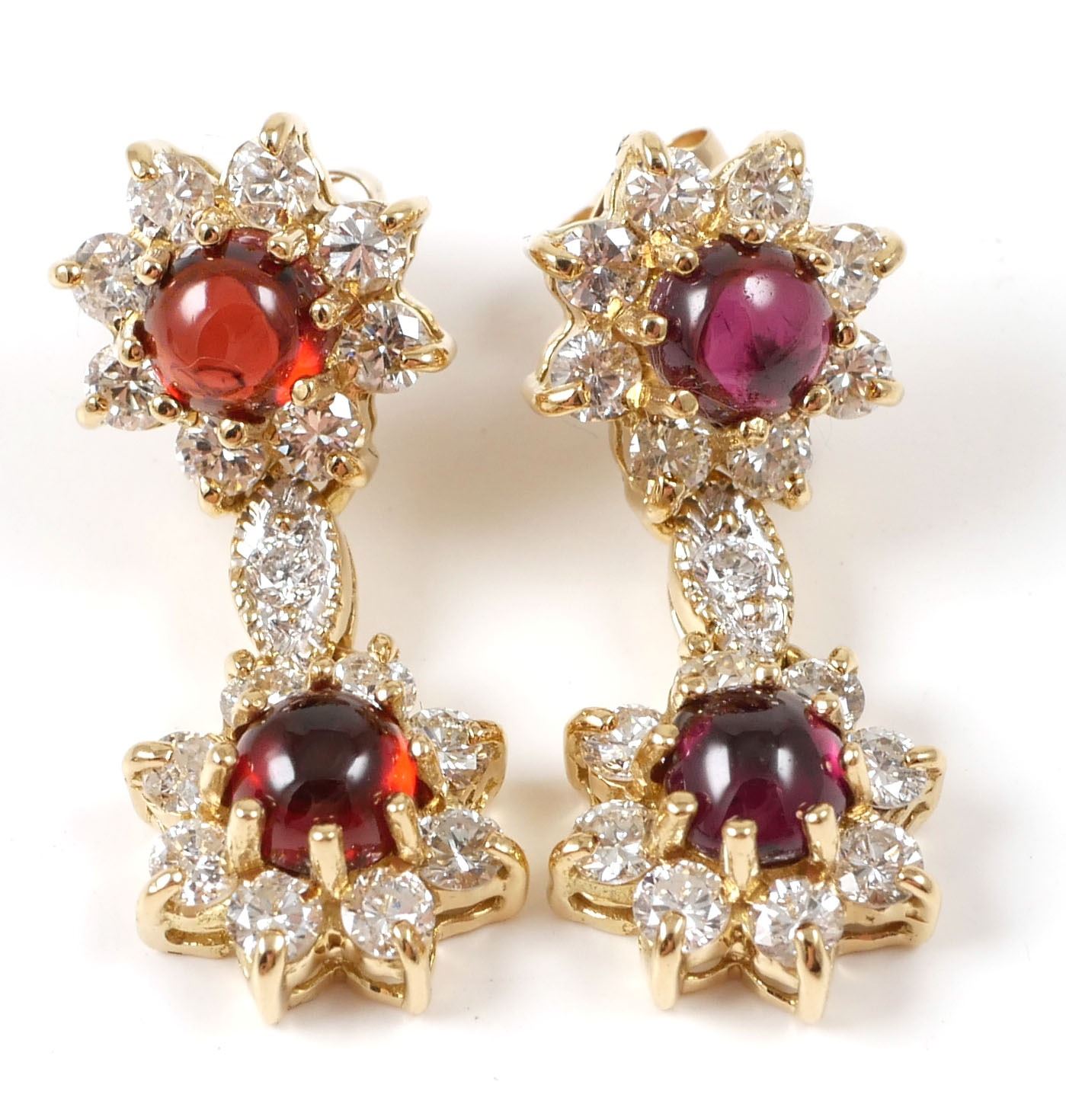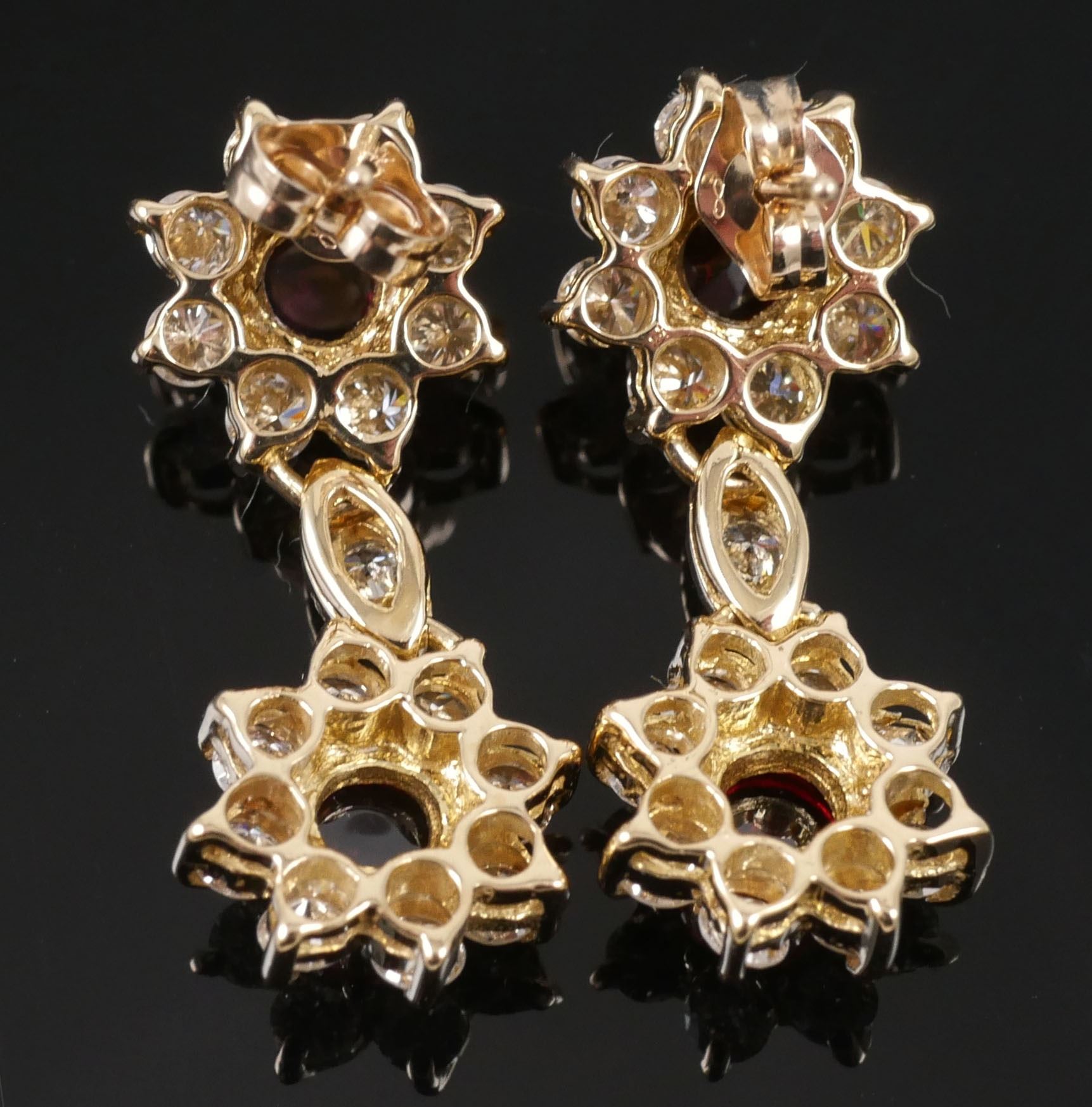 14K yellow gold earrings with garnet & diamonds in a flower pattern. Earrings are 1" in length, overall weight is 6.4 grams. Good condition with normal wear, see photos for more details on condition. (19)