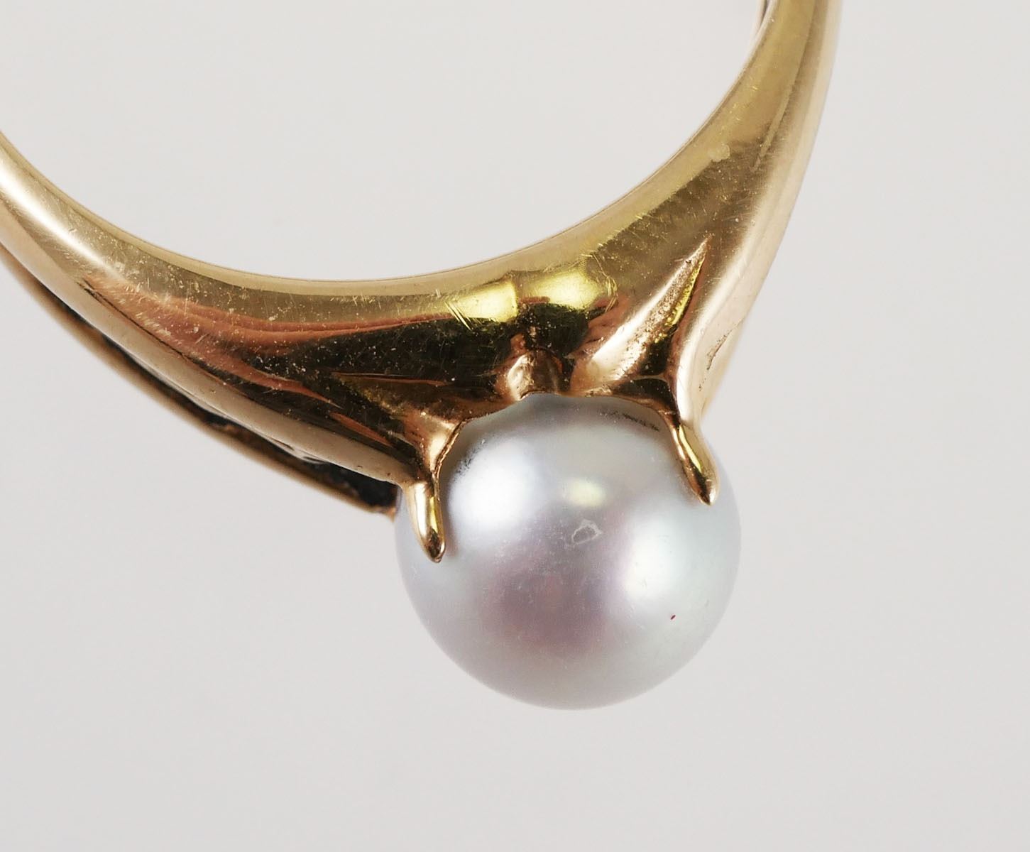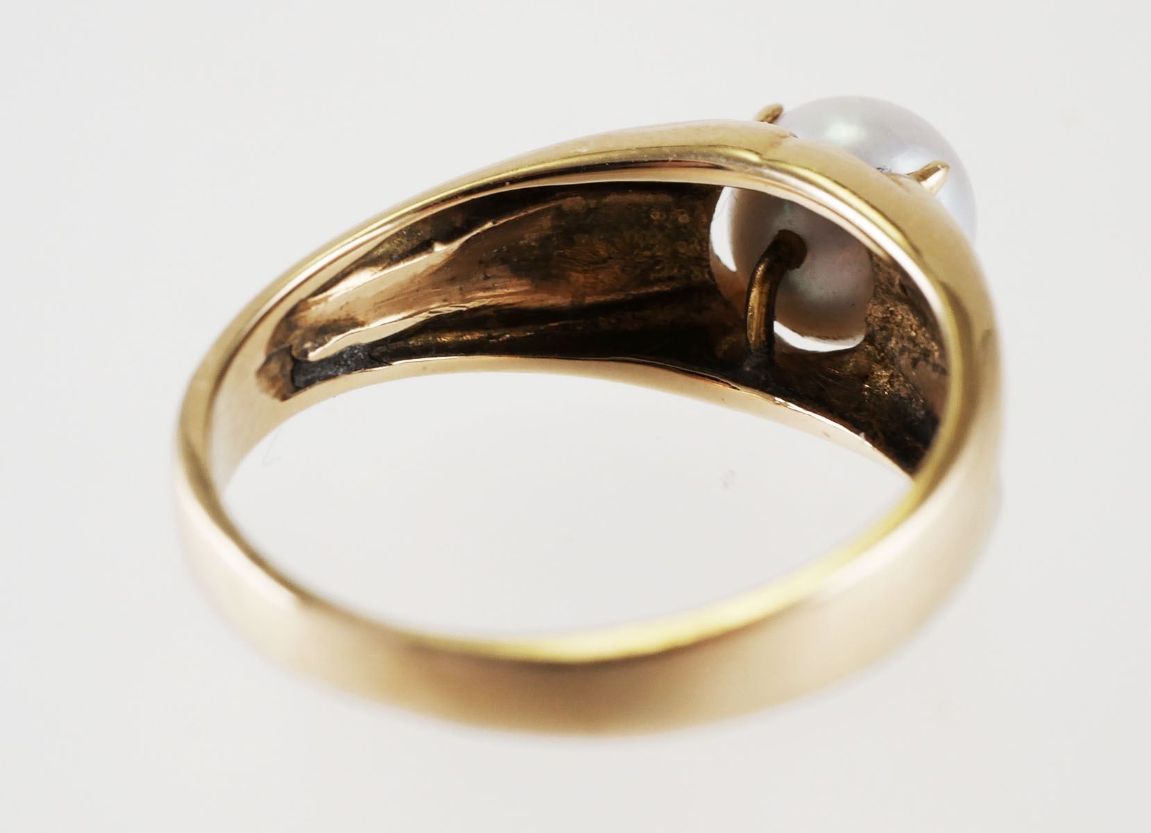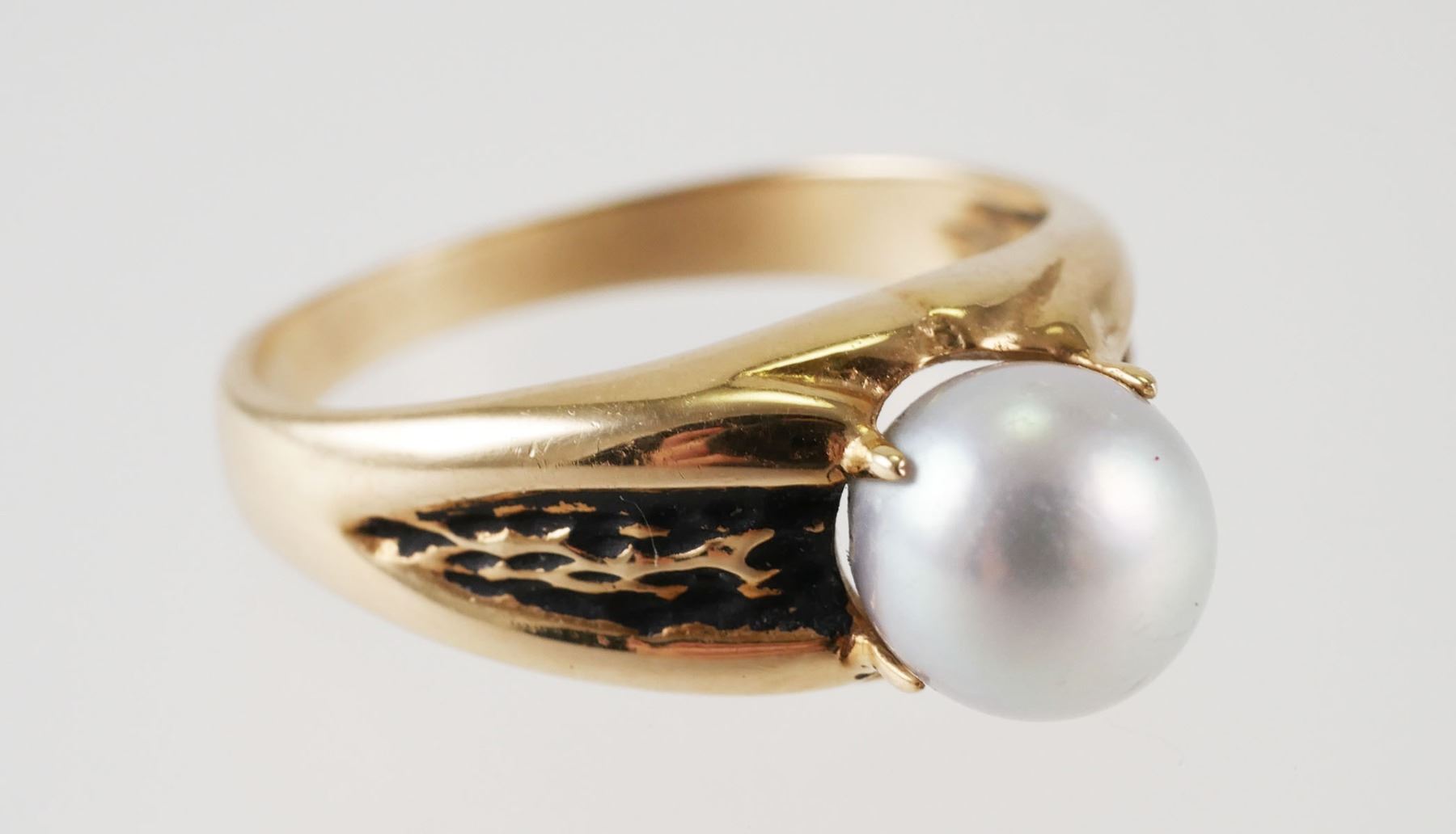 14K yellow gold ring with unique scroll work & 7mm gray pearl solitaire with nice luster. Ring is size 9 1/2, overall weight is 4.8 grams. Good condition with normal wear, see photos for more details on condition.
