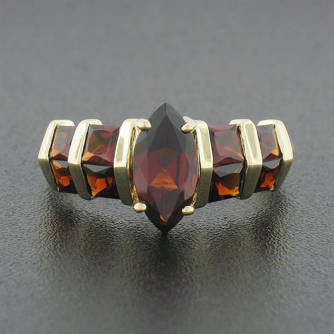 A solid 14k yellow gold ring, with 1 marquise brilliant cut natural garnet (9.9x5.0mm), and 8 square faceted cut natural garnets (2.7x2.7mm each). The ring is size 7.0, weighs a total of 2.60 grams, and measures 9.9mm wide.
