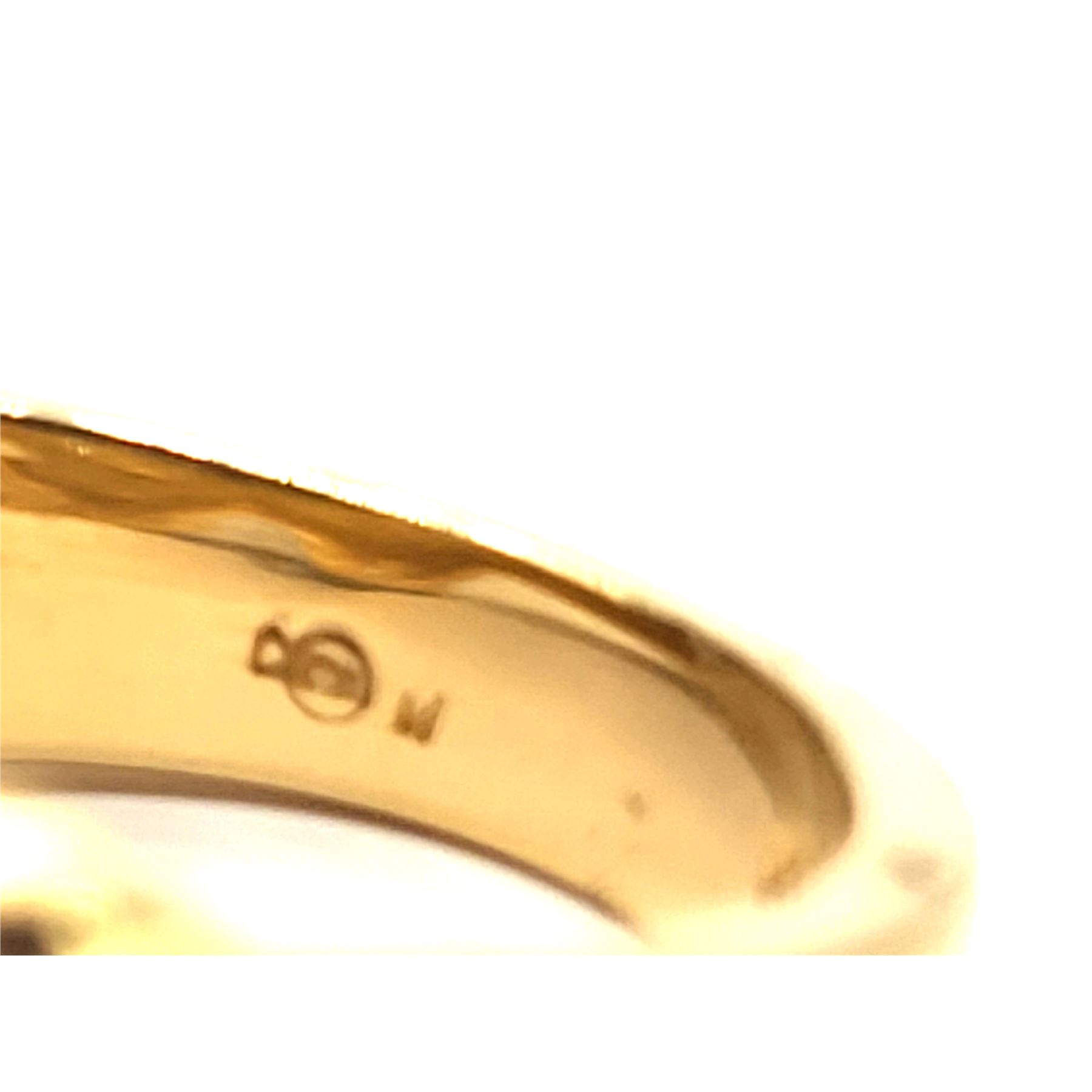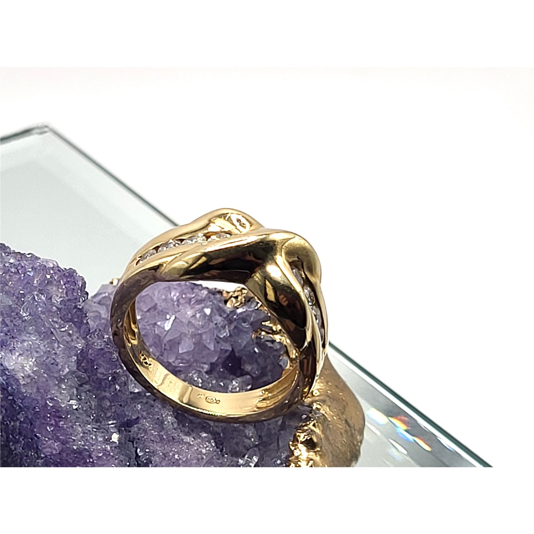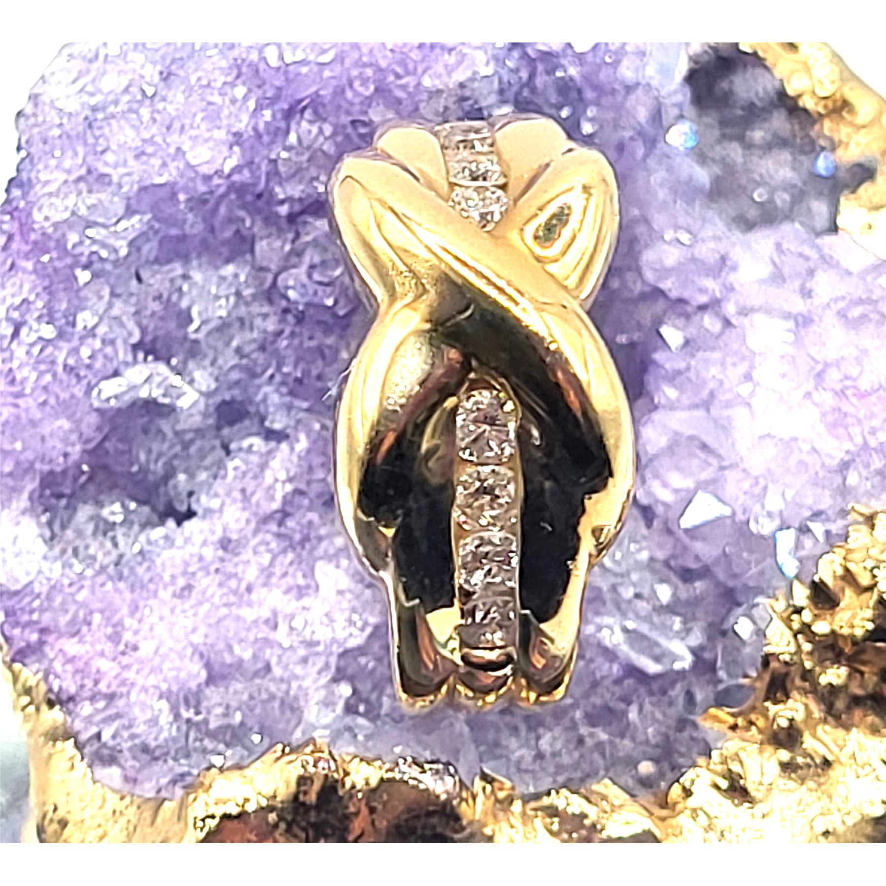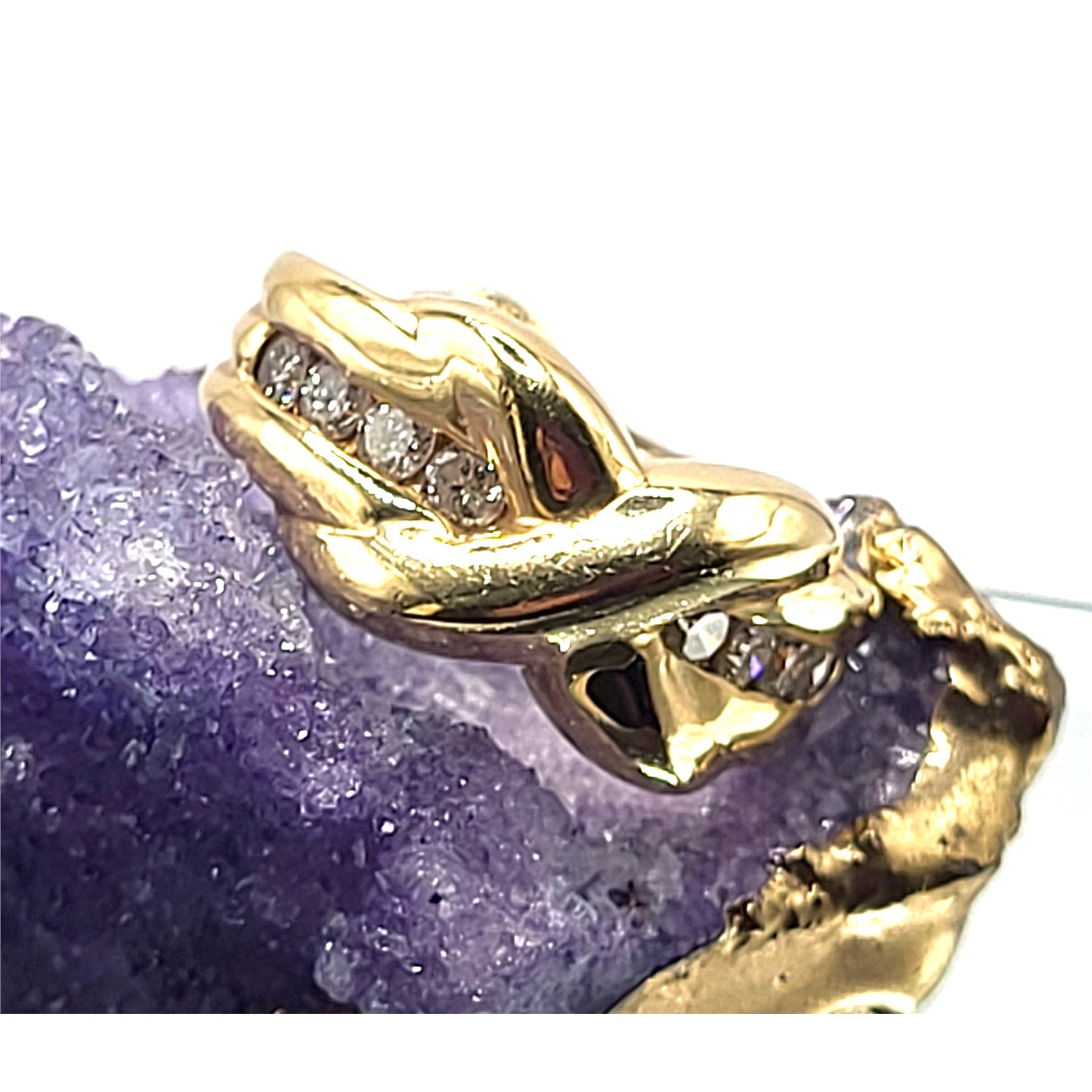 This 14 karat yellow gold ring is set with .54 carats total weight round, brilliant-cut, H color, SI2-I1 clarity, earth-mined diamonds.& nbsp; The & quot;kiss& quot; in the center& nbsp; of the channel-set diamonds is like a strong embrace the bonds each side together, as one. The ring is approximately 9.75mm at the top and tapers to approximately 3.8mm shank. It is US size 6.5 and can be sized for an additional charge. Please contact Bidfair Fine Jewelry for sizing details. Admin: G11241/1grt