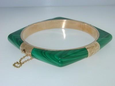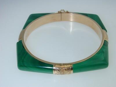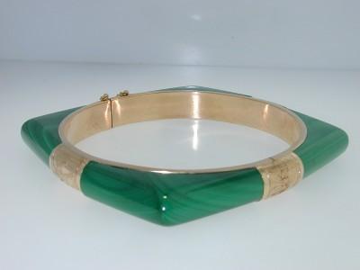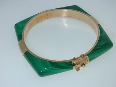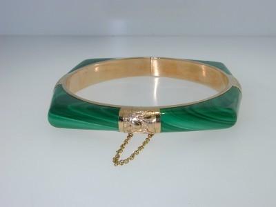 14K Yellow Gold Malachite Bangle. The total Bangle's weight is 36.7 grams. The inside Measurement of bangle is 56 x 58 mm, The outside Measurement of bangle is 65x 65mm.