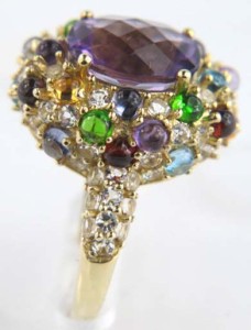 14K Yellow Gold Multi Color Amethyst RinThe total ring's weight is 7.5 grams.The size of the Amethyst is 11 x 9 mm. 3 cts approximately.The ring size is 6