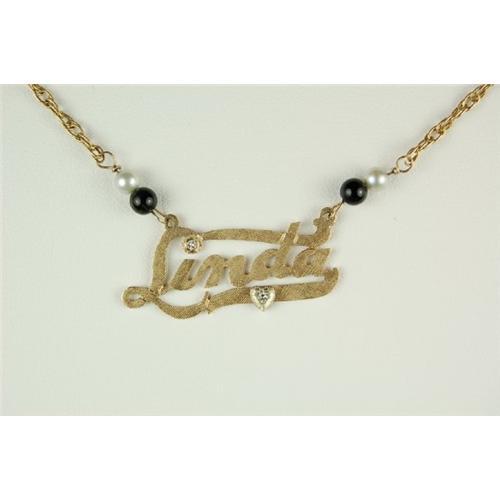 This Gold and Diamond Necklace is from my Personal Collectiion and it is circa 1975. It is a 14k Yellow Gold Necklace 20 inches in length. The Name LINDA is beautifully written in 14k Gold with DIAMOND accents. There are also 2 Pearls and 2 Black Onyx. It is in superb condition!