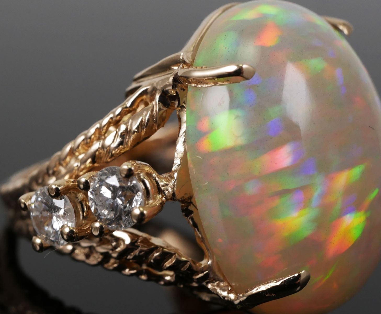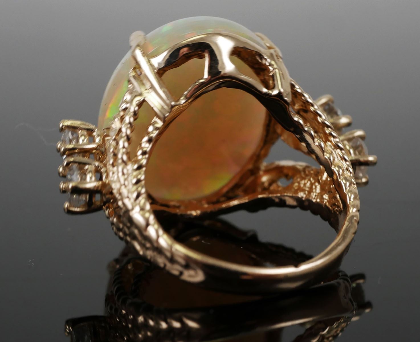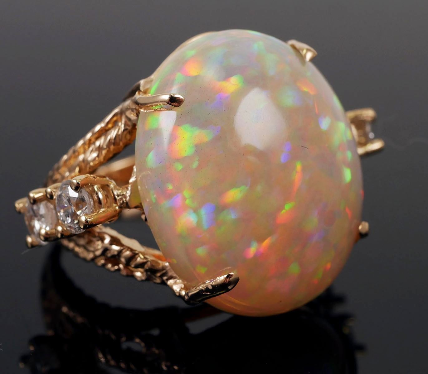 14K yellow gold & 11 carat fiery opal (19mm x 16mm) with .60 carats of round cut diamonds on the sides. Size 4, overall weight 7.4 grams. Excellent condition. (2)