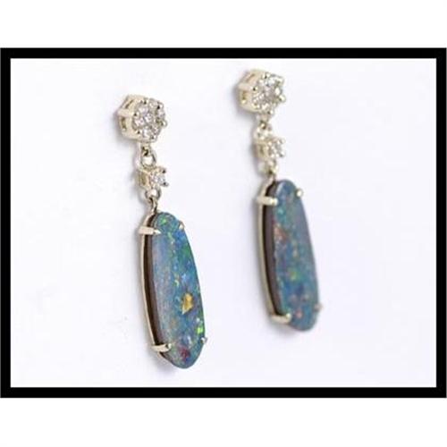 Unique earrings with 2 opals that weigh 0.31 carats and measure 18 millimeters (11/16 inches) long x 6 millimeters (1/4 inches) wide. Also, the earrings have 16 diamonds set in 14K yellow gold. The earrings measures 32 millimeters (1-1/4 inches) x 6 millimeters (1/4 inches) wide and weigh 2.24 grams total weight.