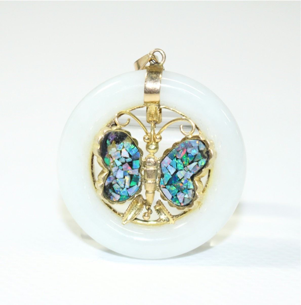 14K Yellow Gold Opal Inset Butterfly with Circular Jade Pendant. Measures 1 1/2" in diameter with a total weight of 16.39 grams.