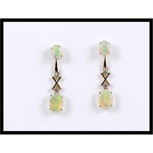 Adorable earrings with 2 oval cut opals that weigh 0.66 carats and in the earring jackets, 2 oval cut opals that weigh 1.60 carats and 4 full cut diamonds set in 14K yellow gold. The earrings measure 27.6 millimeters (1.09 inches) long x 5.9 millimeters (0.23 inches) wide and weigh 2.70 grams total weight.