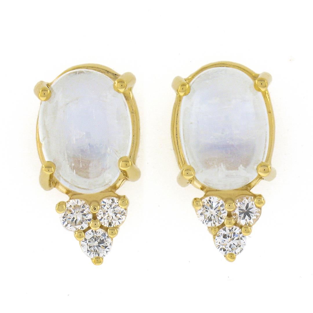 A solid 14k yellow gold cluster earrings, with 2 oval cabochon cut natural moonstone (8.1x6mm), & 6 round cut natural diamonds (G-H - VS1-VS2 ; 0.20ctw). The earrings measure approximately 13.3x6.9mm and weigh a total of 2.63 grams.