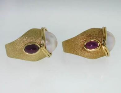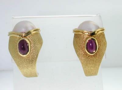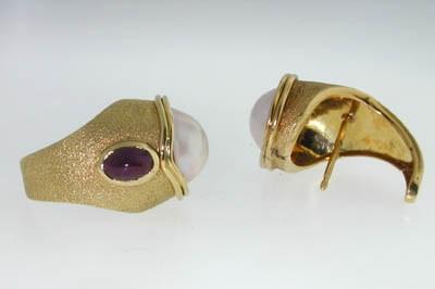 14K Yellow Gold Pearl and Ruby Earring. The total earring's weight is 11.1grams. The weight of Ruby: 1cts. Total size of pearl: 10x10mm. The size of earring is 20x15 mm.