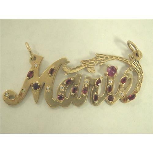 Pendant in 14K gold that spells "Marie". Measures approx 2.5" x 1" and weighs 15.0 grams. Includes 10 marquis cut rubies approx .079 carats each, 2 round cut rubies approx .036 carats each, one approx .13 carat ruby, one cabachon cut ruby approx .95 carats and eight approx .04 carat diamonds. TCW = 1.94 rubies.