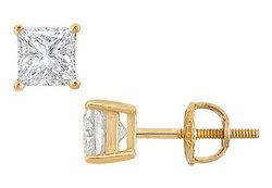 A pair of perfectly matched princess-cut diamonds are set in a rich 14K yellow gold 4-prong mounting. These diamond stud earrings have a total weight (TDW) of 1.50 ct and are available in either screw-back or push-back. The TDW includes the combined weight of both diamonds.