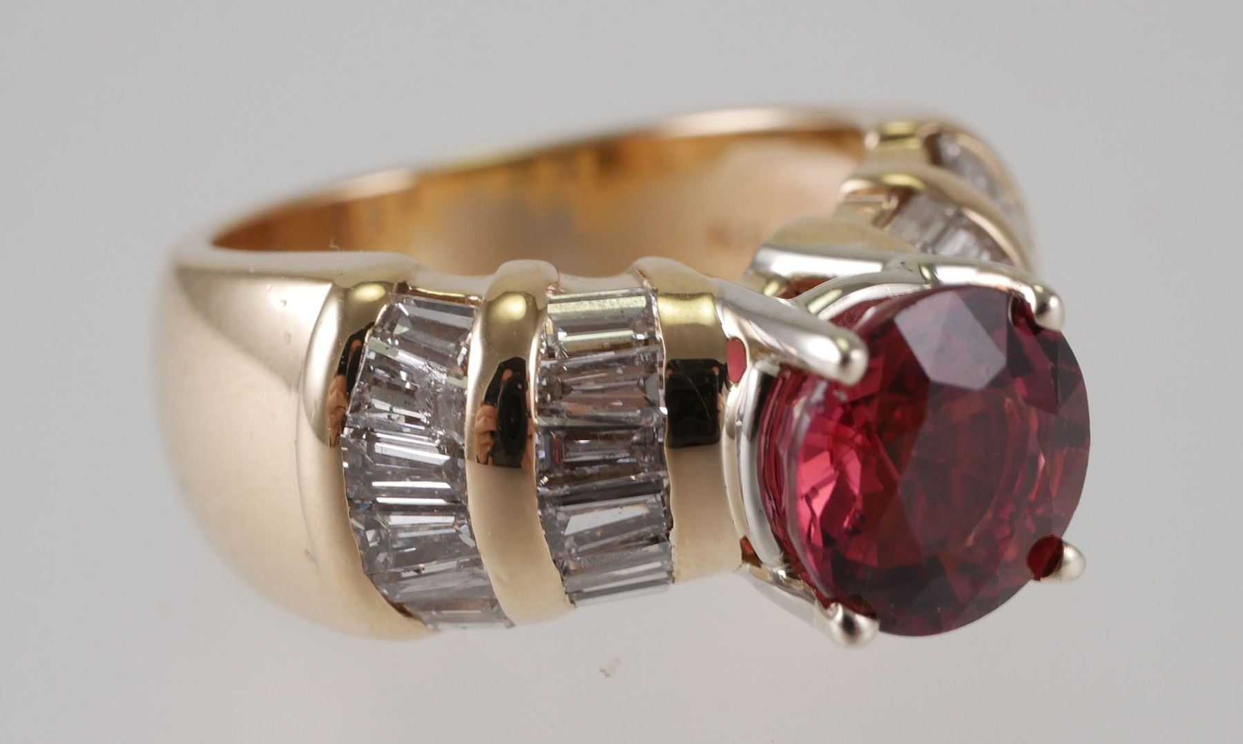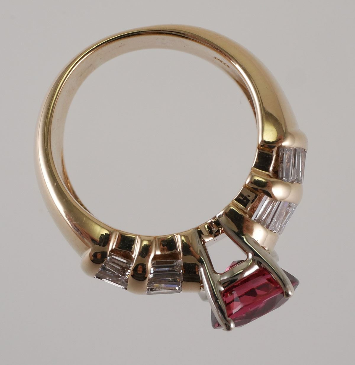14K yellow gold ring with round rubellite tourmaline (8mm dia.) 2.2 carats & approx. .25 total carat weight baguette diamonds. Ring is size 5 1/4 with an overall weight of 11.1 grams. Good condition with normal wear, see photos for more details on condition. (9)