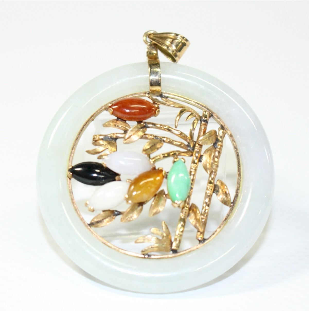 14K Yellow Gold Rainbow Accented Circular Jade Pendant. Measures 4 1/2cm in diameter with a total weight of 20.06grams.