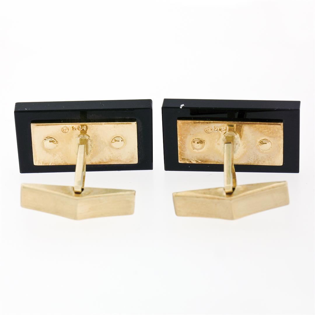 A Vintage solis 14k yellow gold rectangular cufflinks, with 2 rectangular cut natural black onyx (22.0x12.0mm). These cuff links have a swivel back design with a clearance of 9.80mm, weigh a total of 11.87 grams, and the front panels measure 22.0x12.0mm.