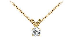 A round diamond is delicately suspended in a rich 14K yellow gold 4-prong mounting. This diamond solitaire pendant has a total weight (TDW) of 0.25 ct and comes with a standard 16 14K gold chain.
