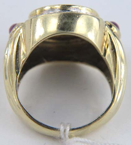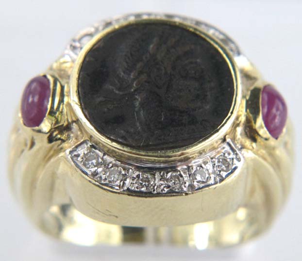 14K Yellow Gold Ruby Ancient Coin RingThe weight of the ring is 12.5 grams.The weight of the diamond is 0.12 cts approximately.The measurement of the ancient coin is 13 mm in diameter.The ring's size is 5.75