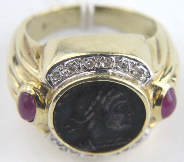 14K Yellow Gold Ruby Ancient Coin RingThe weight of the ring is 12.5 grams.The weight of the diamond is 0.12 cts approximately.The measurement of the ancient coin is 13 mm in diameter.The ring's size is 5.75