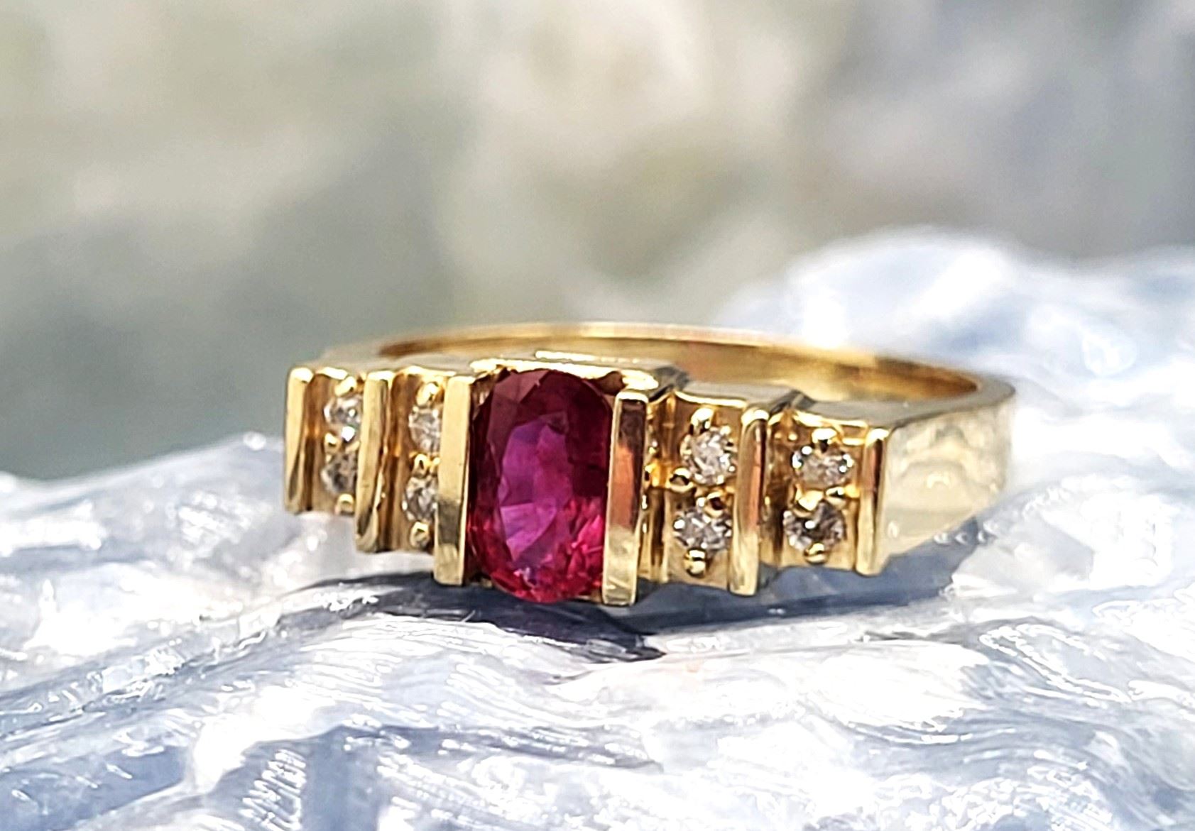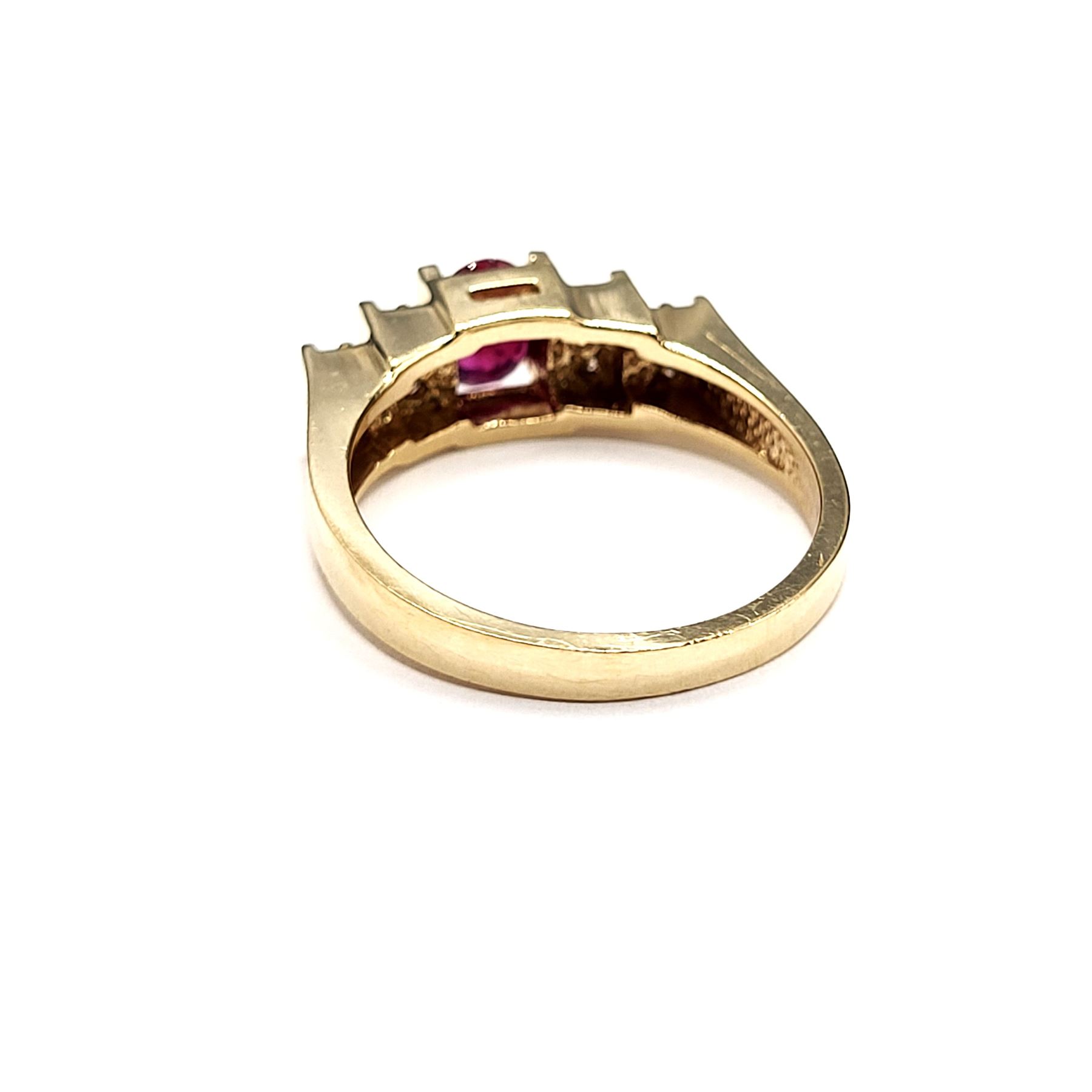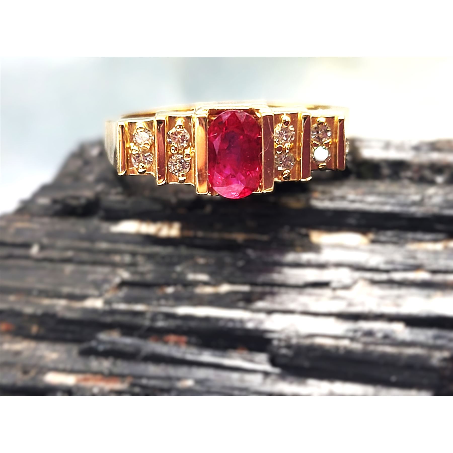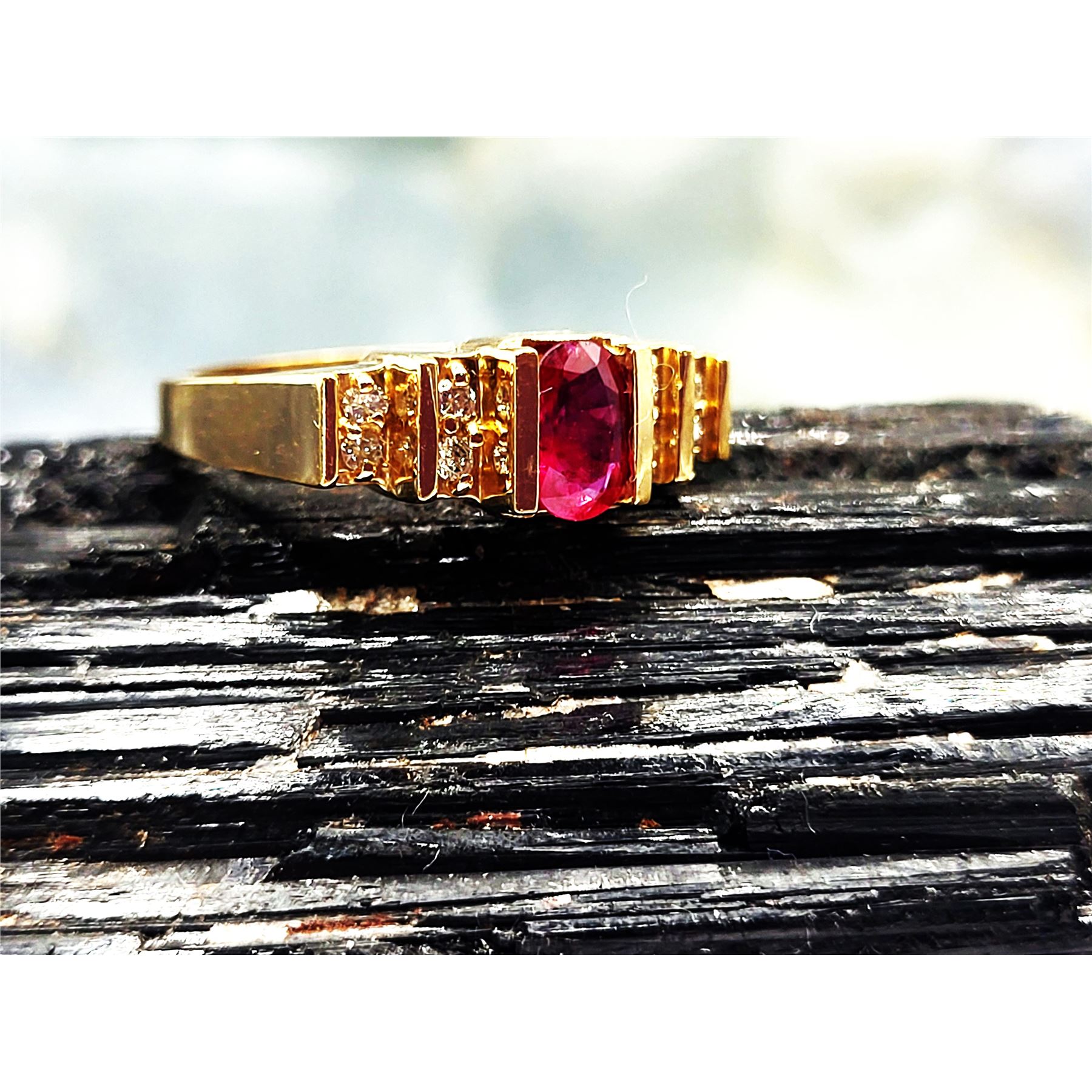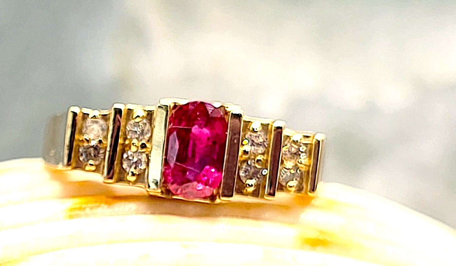 This is a 14 karat yellow gold ring that features an approximate .60 carat oval-cut, tension-set, genuine ruby with approximately .16 carats of round, brilliant-cut, H color, SI2-I1 clarity diamonds in the stepped shoulders that taper to an approximate 2.25mm shank. This ring is US size 7 and can be sized for an additional charge. 100021/4.1G