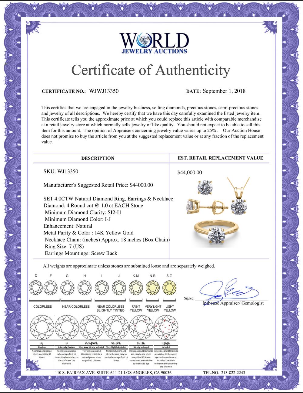 14K Yellow Gold Jewelry SET 4.0CTW Diamond Ring, Earrings and Necklace
