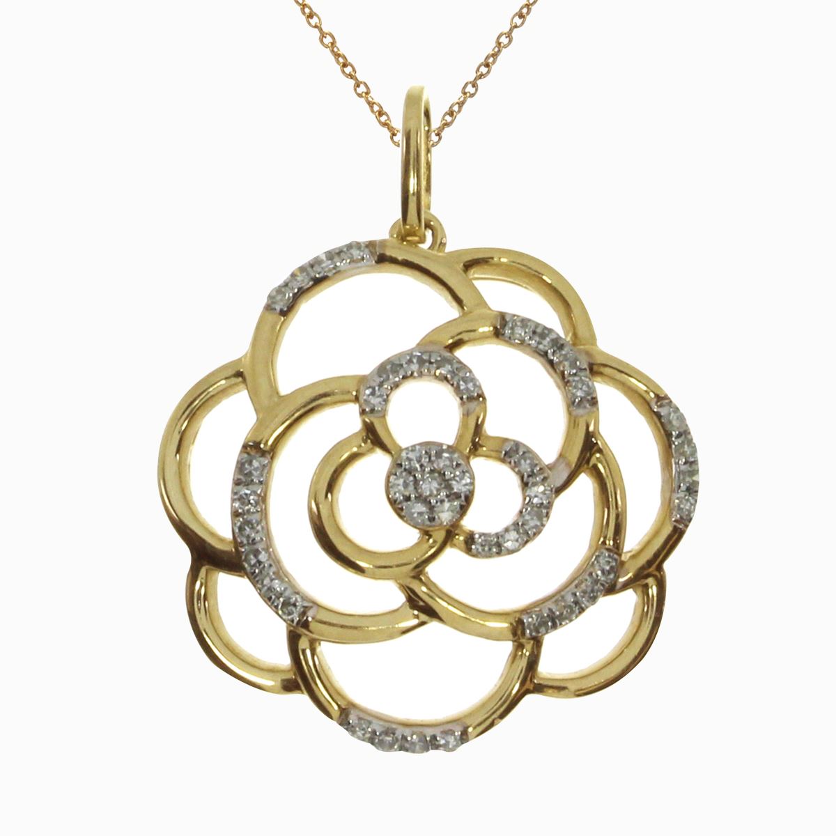 A floral inspired pendant in 14k yellow gold with flashy diamonds. Includes 18" chain.