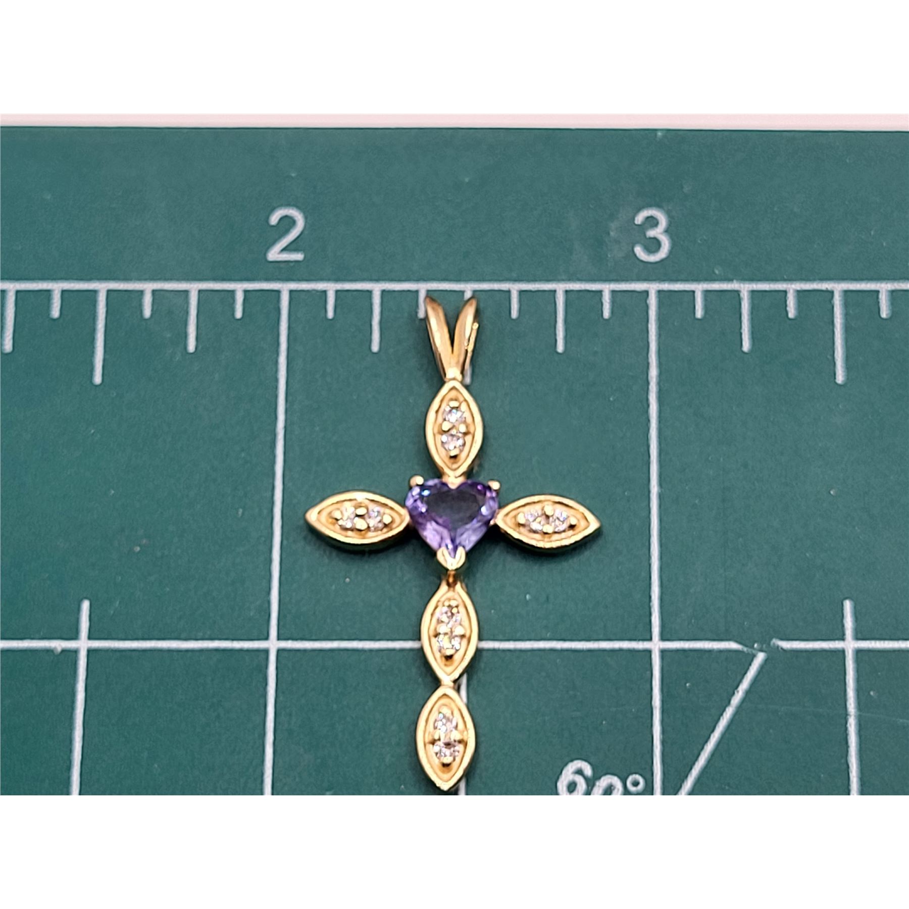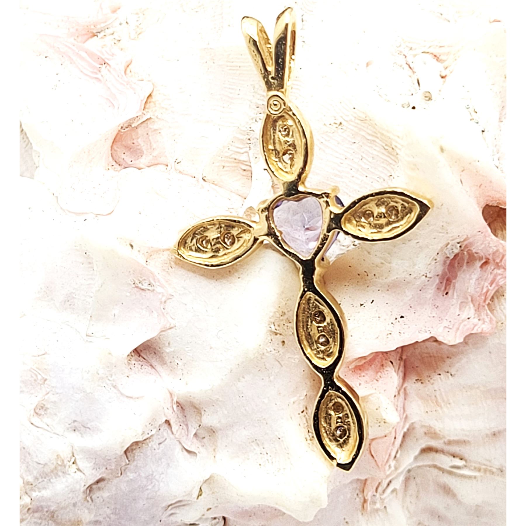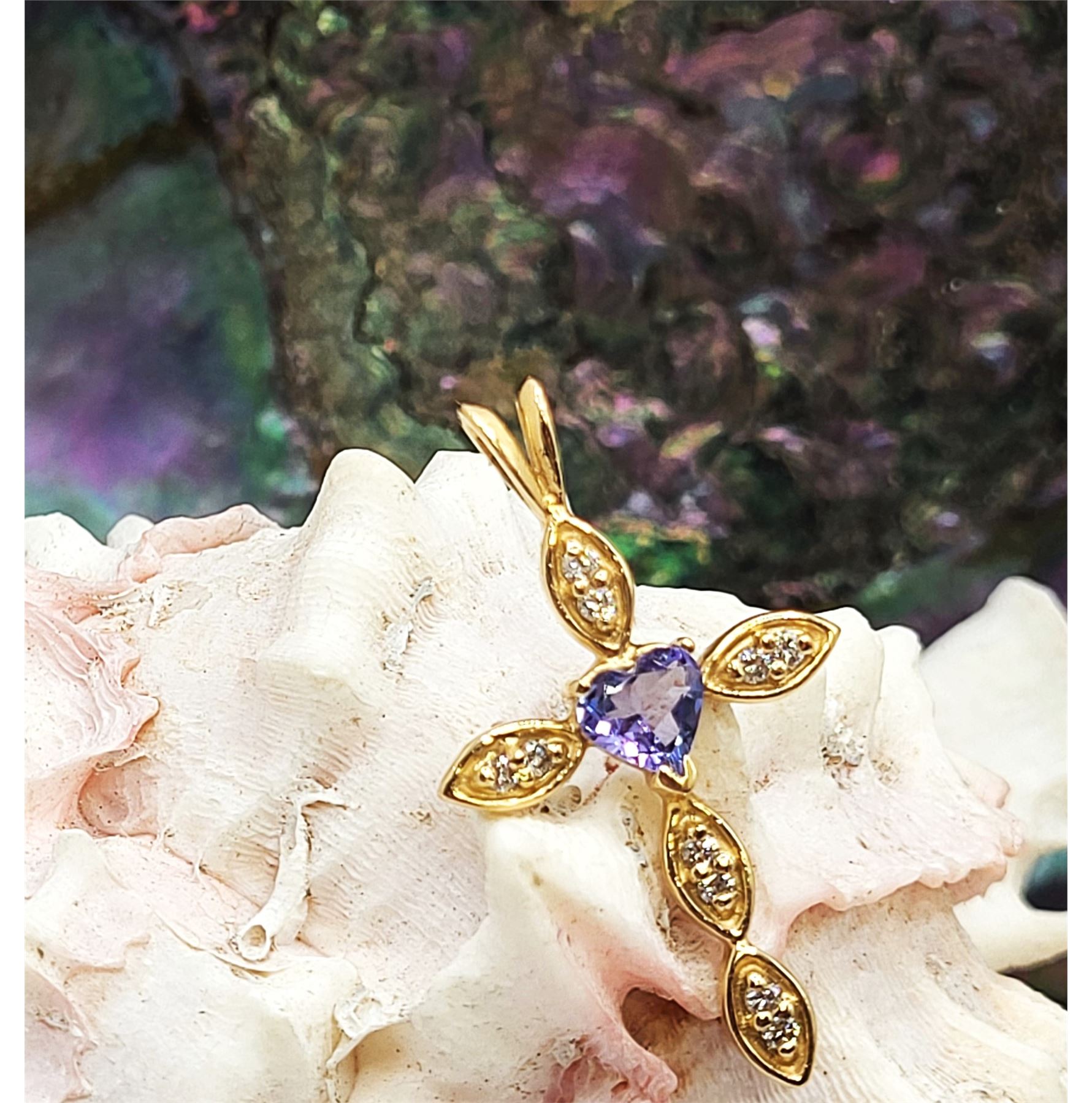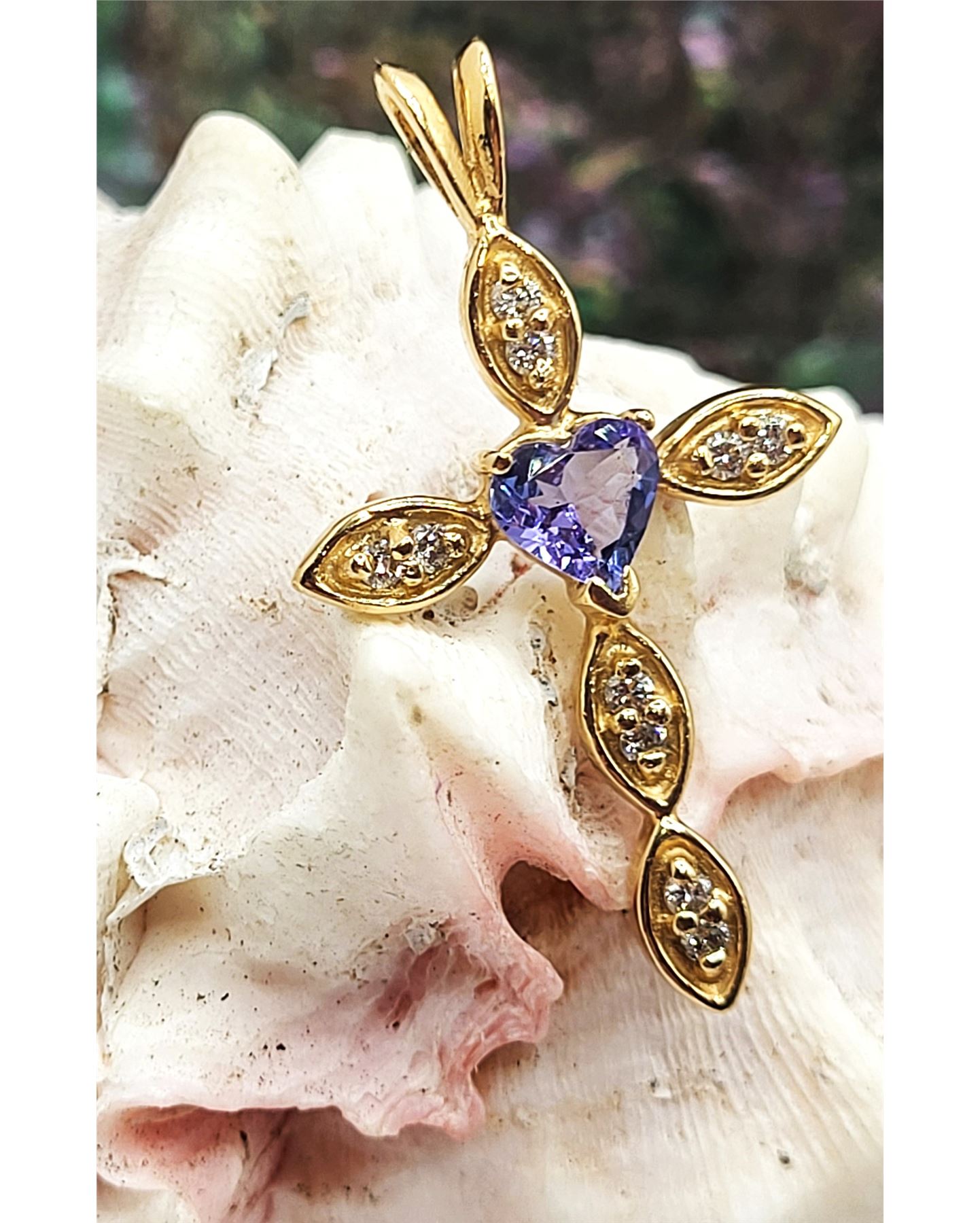 This is a 14 karat yellow gold cross pendant with an approximate .55 carat heart-cut, prong-set, genuine tanzanite and approximately .20 carat total weight of round, brilliant-cut, H, SI2-I1 clarity diamonds on the rail and arms. The cross is approximately 1.25" tall and 7/8" wide and the rabbit ear bail can accommodate an approximate 1.25mm thick chain. This is a brand new item with manufacturer's approval to sale in a public auction. It is in excellent condition, but may have fine scratches from shipping or storage. Admin: G11241/14ilt