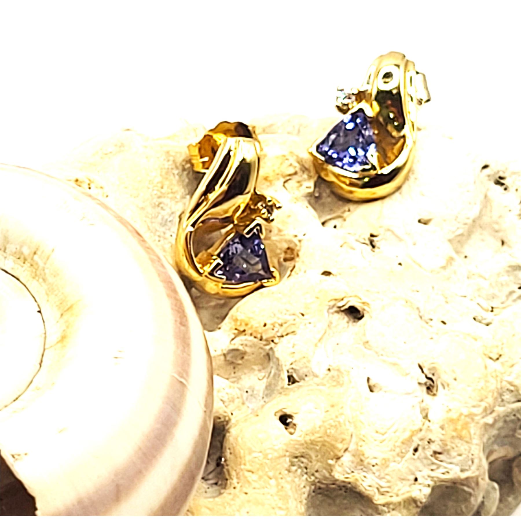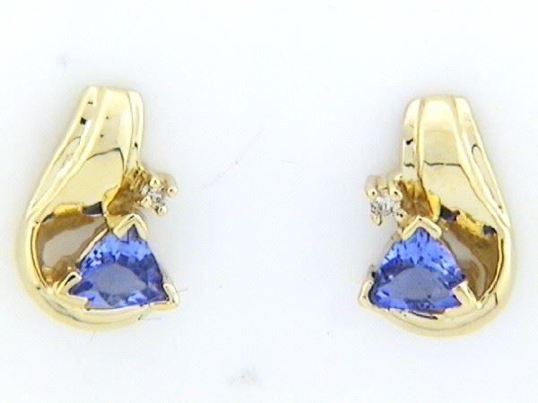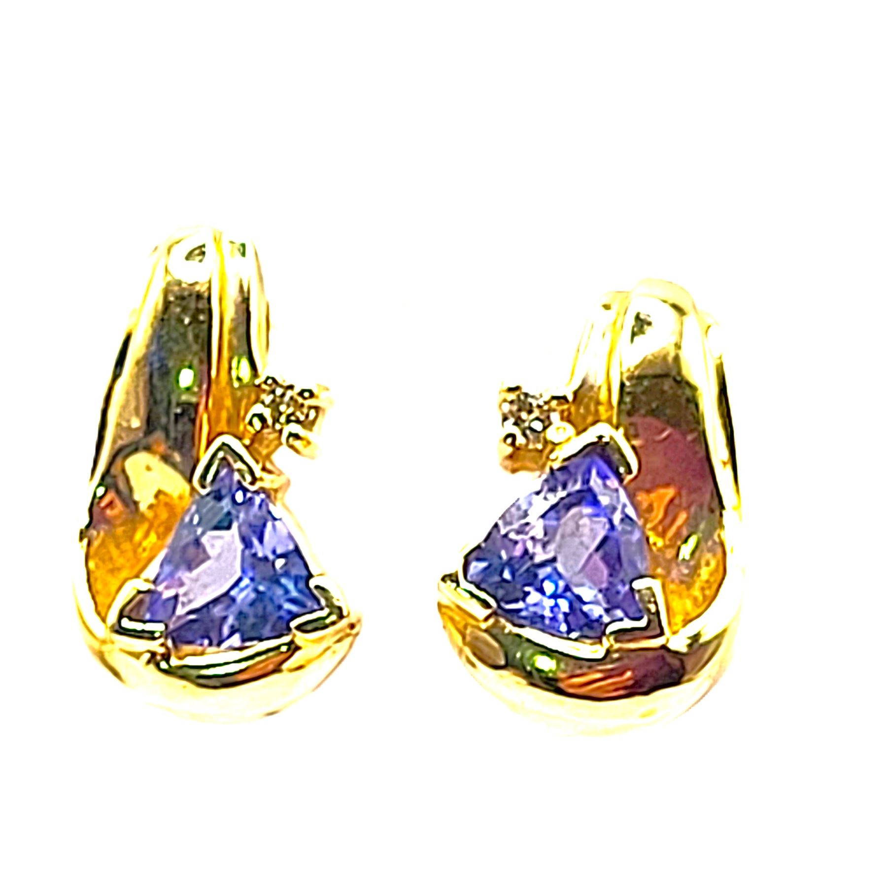 This pair of 14 karat yellow gold earrings features .60 carats total weight of trilliant-cut, light purple, genuine tanzanites and .03 carats total weight of round brilliant-cut G-H color, SI2-I1 clarity accent diamonds. These earrings are approximately 3.8" long and 5/16" wide and really quite strong (not hollow). They attach to the earlobe with posts and friction backs. Admin: G11241/35llh