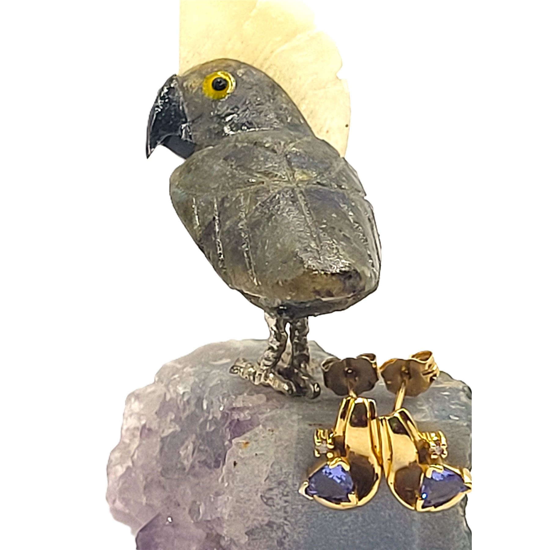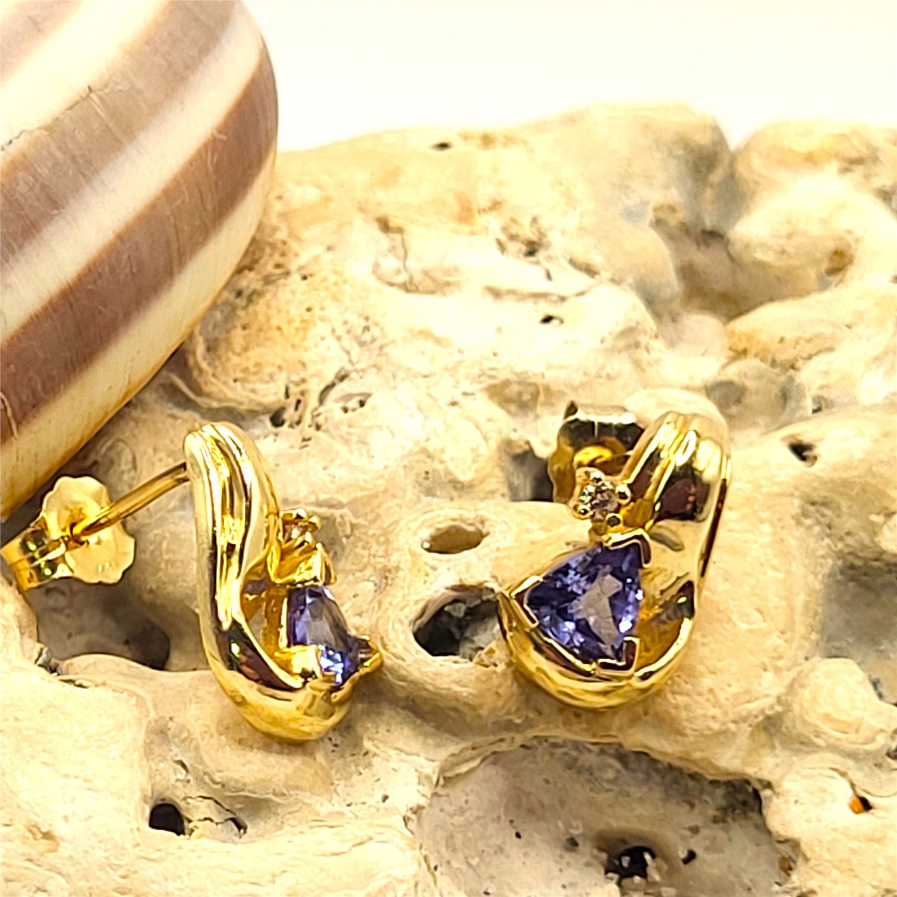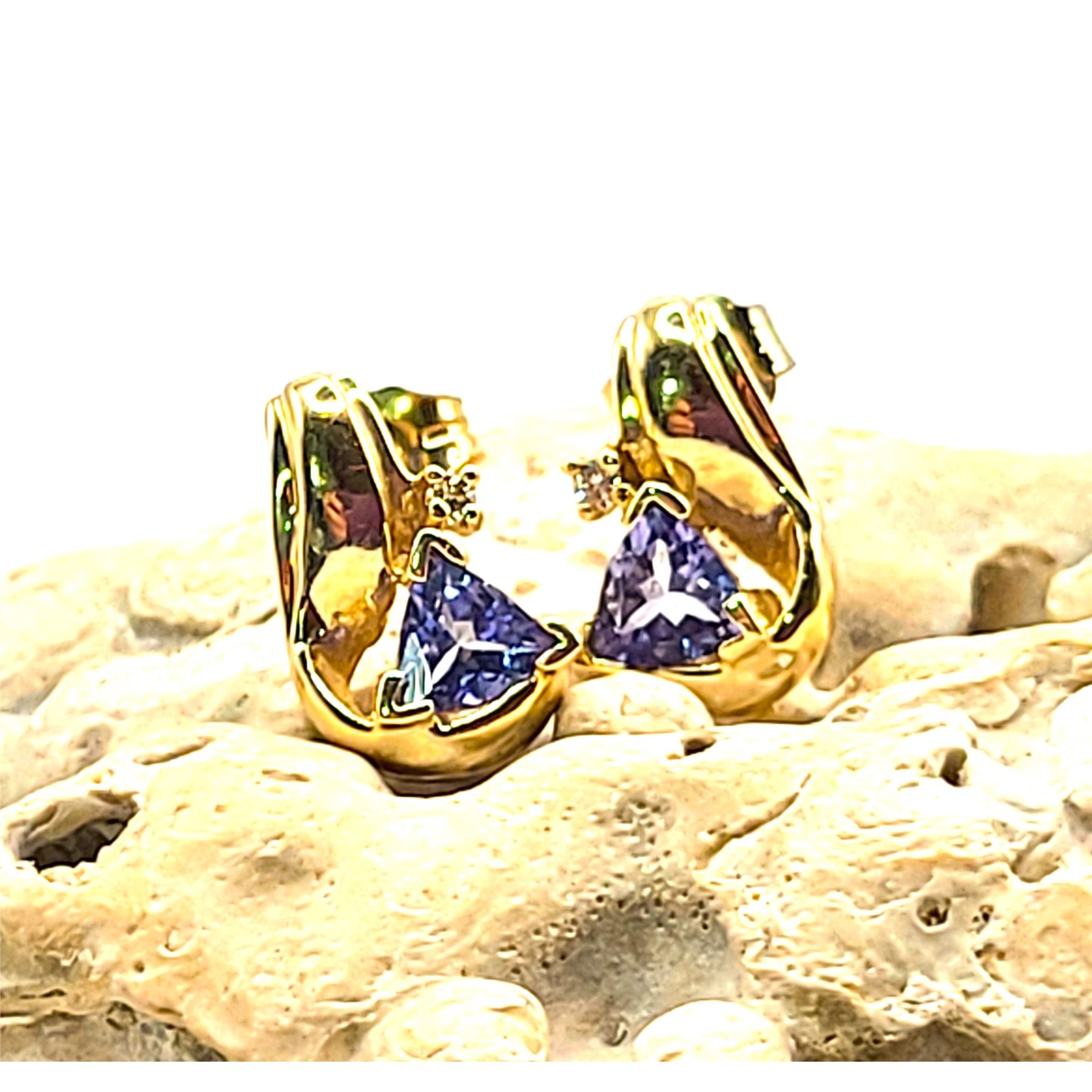 This pair of 14 karat yellow gold earrings features .60 carats total weight of trilliant-cut, light purple, genuine tanzanites and .03 carats total weight of round brilliant-cut G-H color, SI2-I1 clarity accent diamonds. These earrings are approximately 3.8" long and 5/16" wide and really quite strong (not hollow). They attach to the earlobe with posts and friction backs. Admin: G11241/35llh