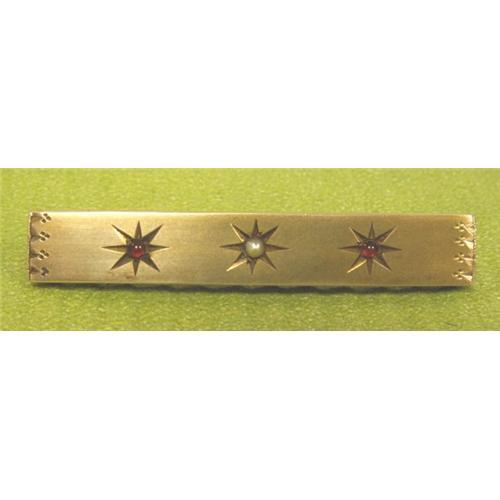 Lovely 14K Victorian bar pin with what look to be 2 small ruby colored stones and a seed pearl. Bar measures 2" x .25". 3.0 grams.