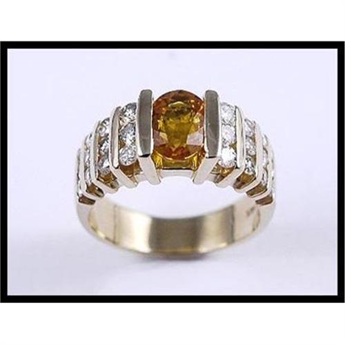 A stylish 14K yellow gold ring contains with 1 oval cut orange yellow sapphire weighing approximately 1.50 carats. Also set are 24 full cut diamonds that have an estimated total weigh of 1.00 carat. This size 5 1/2 ring measures 7.70 millimeters (0.30 inches) wide and weighs 7.30 grams total weight.
