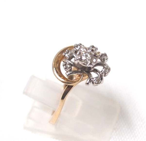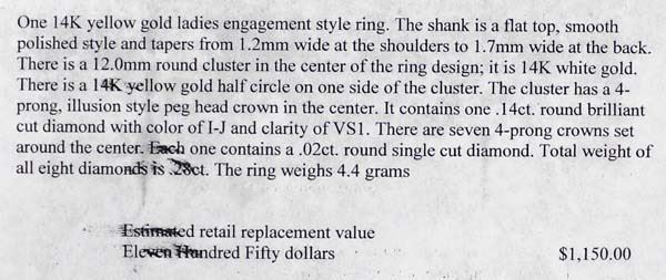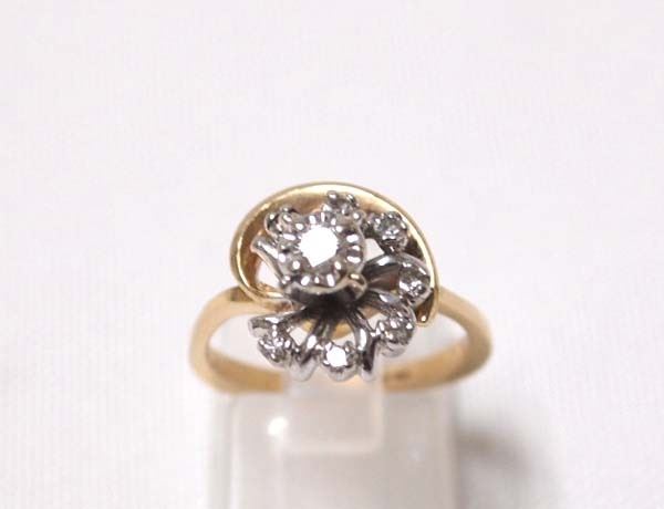 14K Yellow Gold and Diamond Ring, Size 6.5, comes with January 30, 2013 appraisal, ''One 14K yellow gold ladies engagement style ring. The shank is a flat top, smooth polished style and tapers from 1.2mm wide at the shoulders to 1.7mm wide at the back. There is a 12.0mm round cluster in the center of the ring design; it is 14K white gold. There is a 14K yellow gold half circle on one side of the cluster. The cluster has a 4-prong, illusion style peg head crown in the center. It contains one .14ct. round brilliant cut diamond with color if I-J and clarity of VS1. There are seven 4-prong crowns set around the center. Each one contains a 0.2ct. round single cut diamond. Total weight of all eight diamonds is .28ct. The ring weighs 4.4 grams. Estimated retail replacement value as per 2013 appraisal is $1,150.00 ''