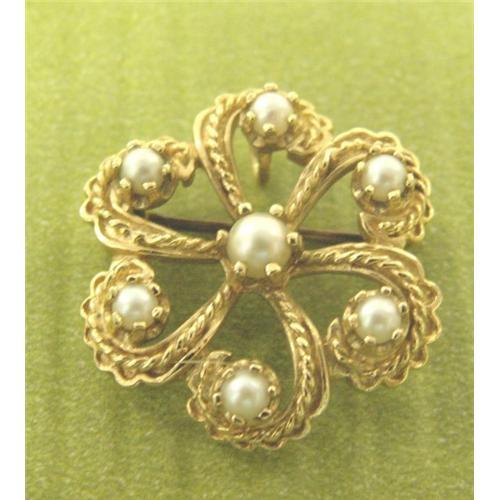 Lovely 14K yellow gold brooch or pendant measures 1" in diameter with a cental 5mm pearl and six 3-4mm pearls all in a finely detailed yellow gold setting. 6.9 grams