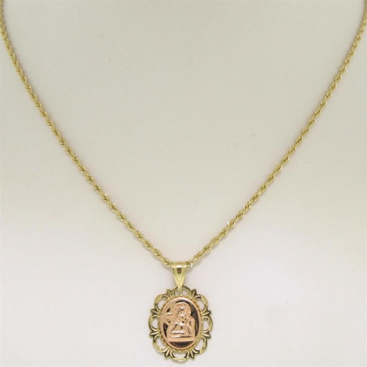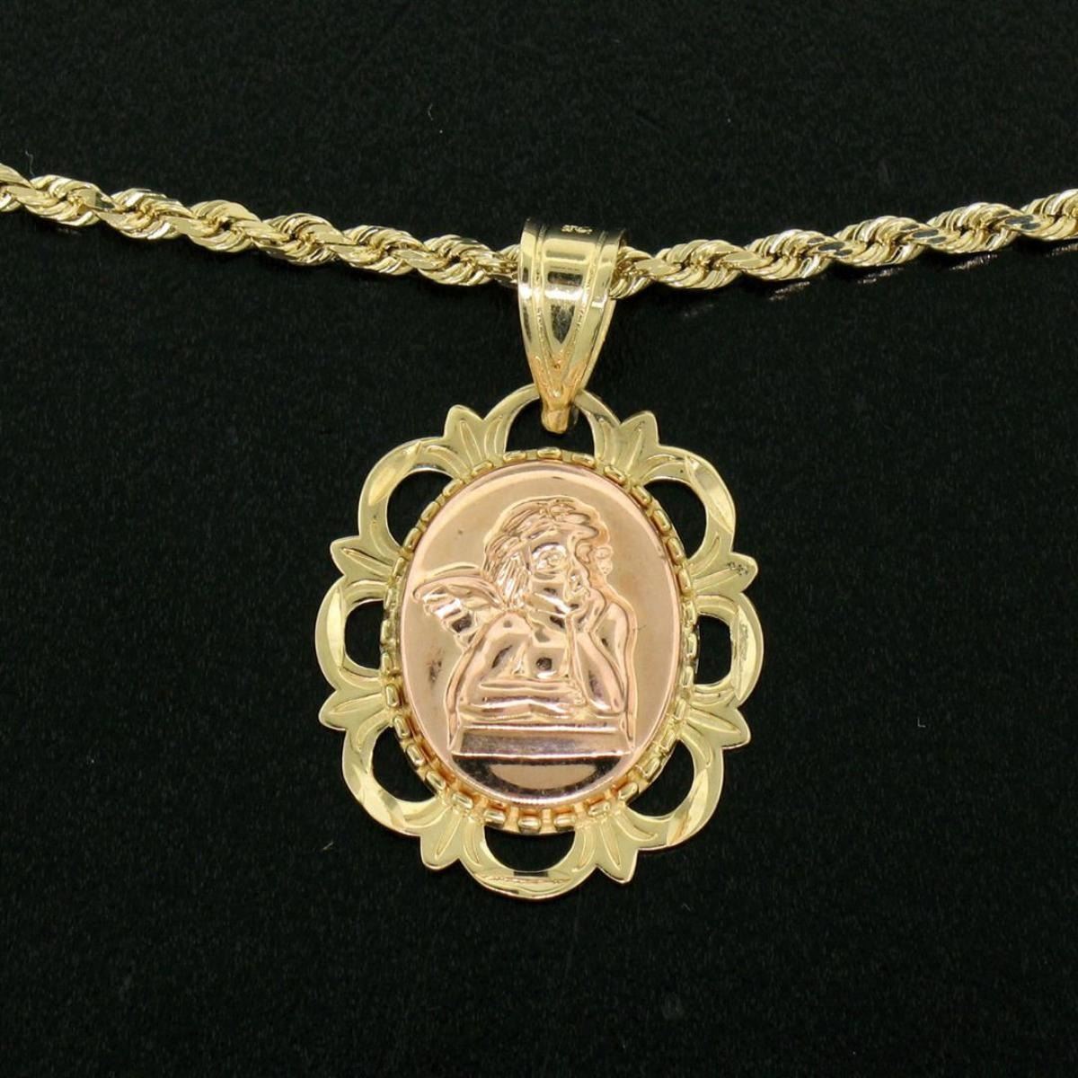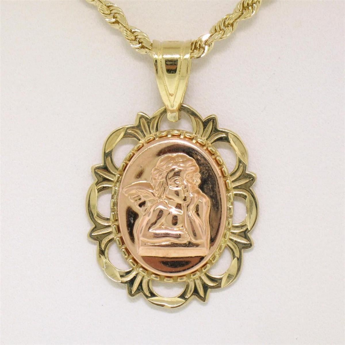 One 14K Yellow & Rose Gold Guardian Angel of God Prayer Pendant w/ 18" Rope Necklace. Item Details: Material: 14K Solid Yellow & Rose Gold, Weight: 6.8 Grams, Chain Type: 1.9mm Rope Link, Chain Length: 18 Inches, Clasp: Lobster Claw, Width: 16.15mm, Height (w/ Bail): 24.7mm, Height (w/o Bail): 19.15mm Thickness: 3.33mm Condition: Like New!
