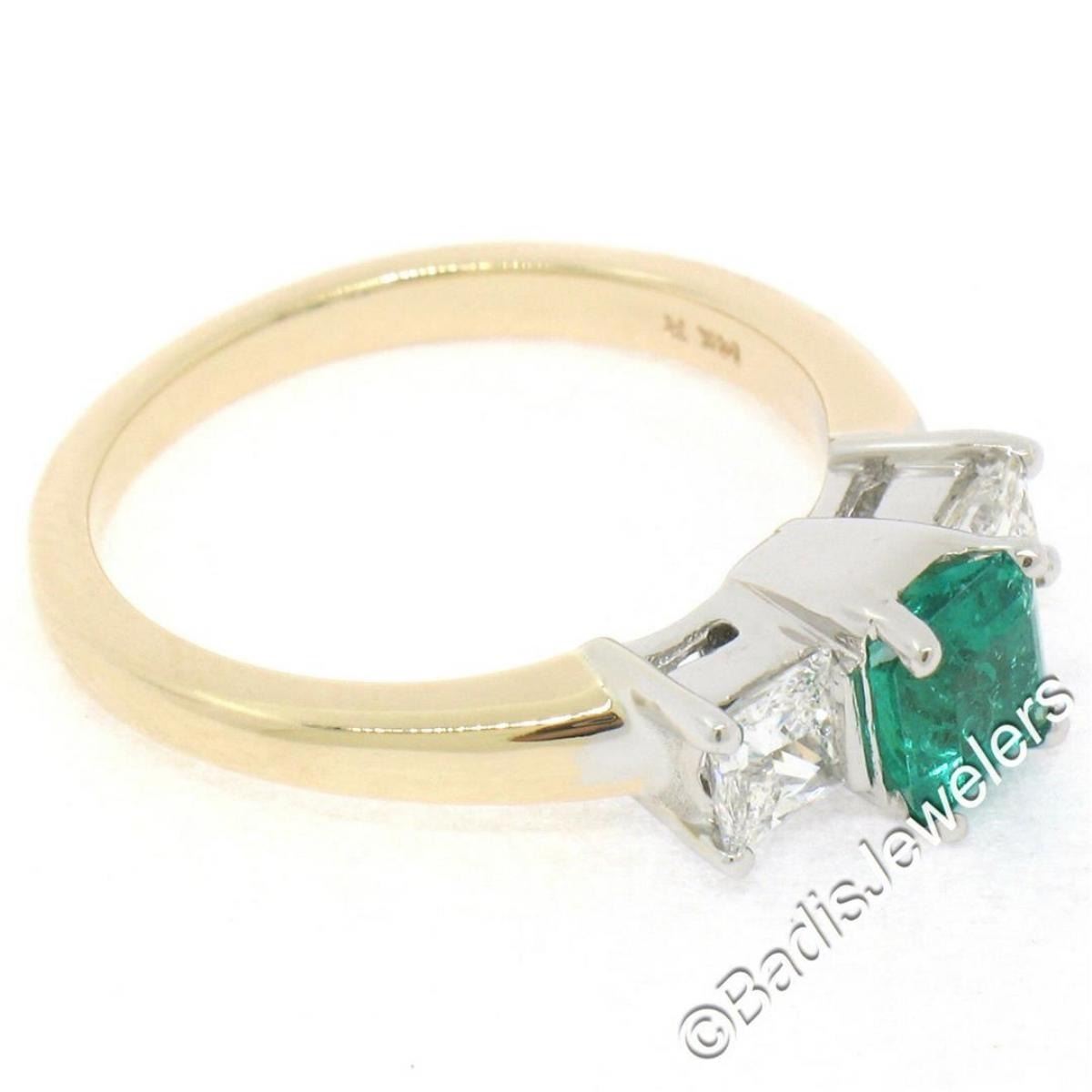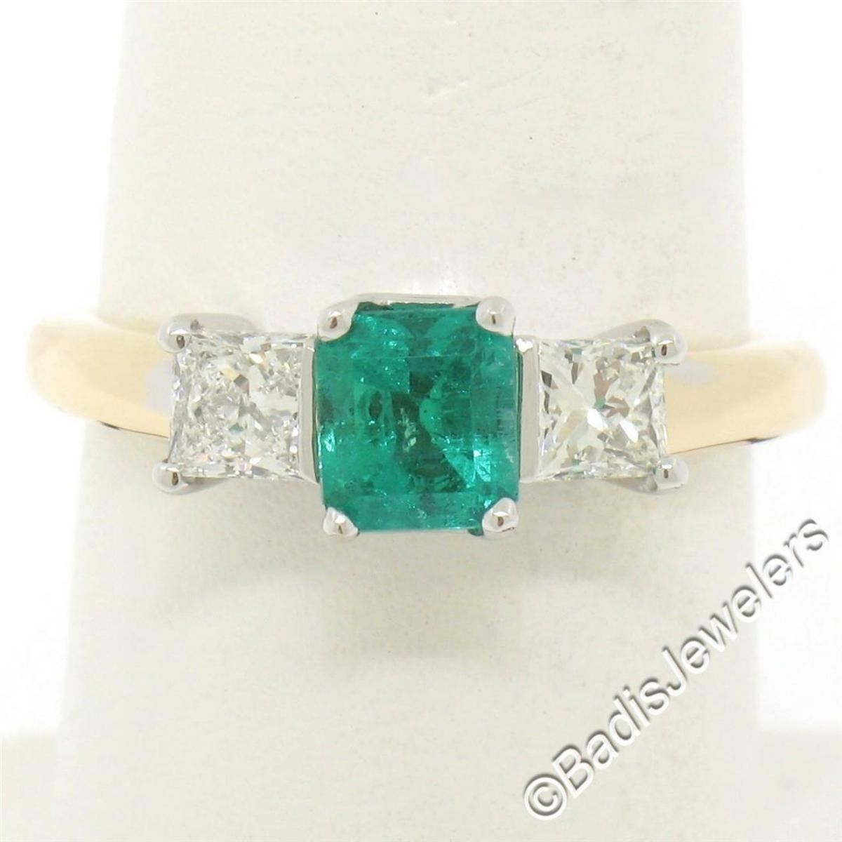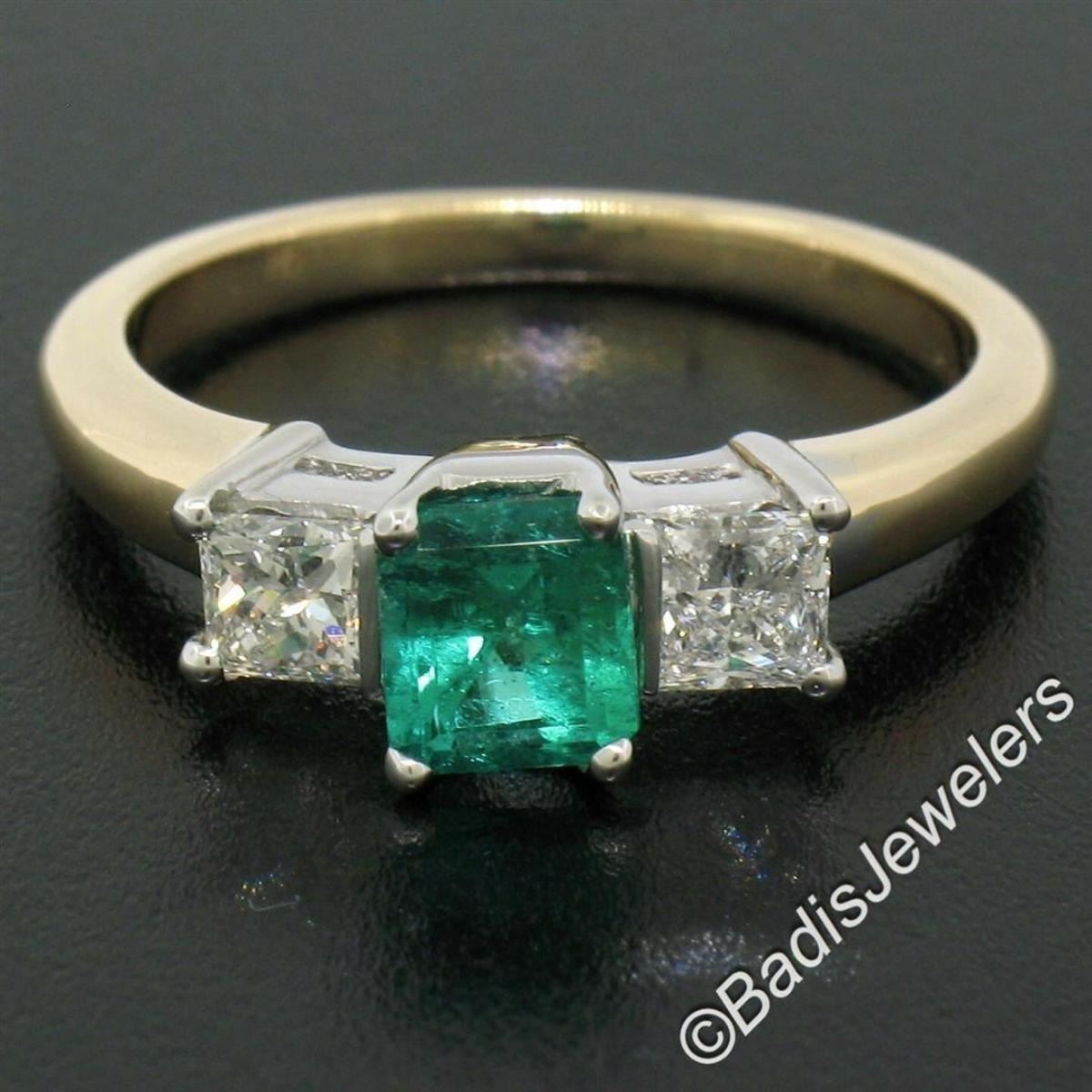 A solid 14k yellow and white gold three-stone ring featuring an emerald cut natural emerald (0.72ct) prong set at its center flanked by 2 prong set princess cut natural diamonds (G - VS1; 0.64ctw). The ring is size 7.5, weighs a total of 4.74 grams, and measures 6.15mm wide.