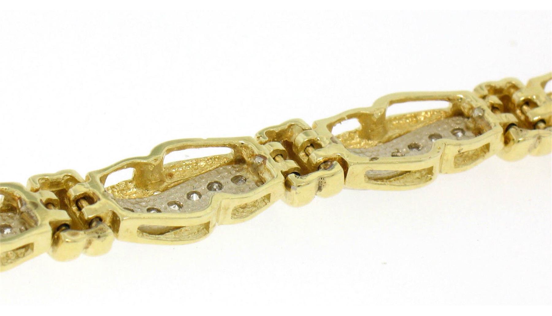 An Estate solid 14k yellow and white gold wavy bracelet, with 60 round brilliant cut natural diamonds (G/H - SI1 ; 1.50ctw). It weighs a total of 19.0 grams, measures 7.84mm wide, and measures 6.75 inches in length.