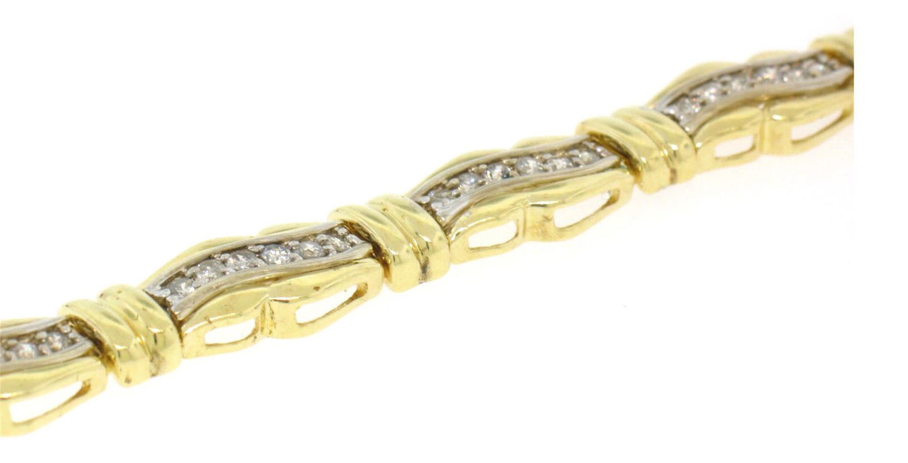 An Estate solid 14k yellow and white gold wavy bracelet, with 60 round brilliant cut natural diamonds (G/H - SI1 ; 1.50ctw). It weighs a total of 19.0  grams, measures 7.84mm wide, and measures 6.75 inches in length.