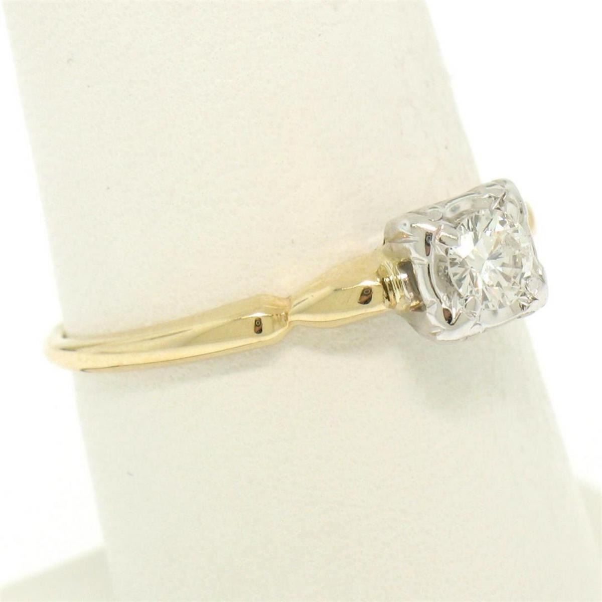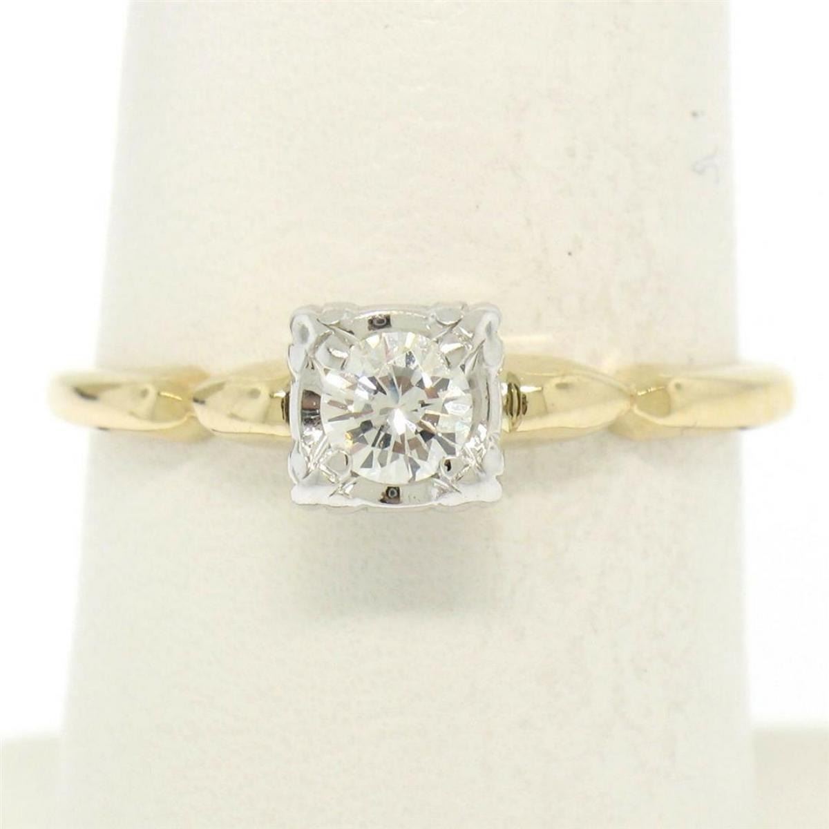 One Vintage 14K Yellow & White Gold Illusion Prong Set 0.25ct Diamond Solitaire Ring. Item Details: Material: 14k Solid Yellow and White Gold, Weight: 2.40 Grams, Stone(s): (1) Natural Genuine Diamond - Round Brilliant Cut - Illusion Prong Set - F Color - VS1 Clarity, Total Carat Weight: 0.25 (approx.), Ring Size: 8.0 (We can custom size this ring.), Ring Width: 5.50mm, Ring Height: 6.50mm rise off the finger, Condition: Vintage piece. Excellent, ready to wear condition!