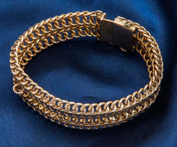 14k Yellow Wide Link Style Bracelet. Measuring 7 1/2 inches in length, 3/4 inches in width, gross weight 57.10 grams.