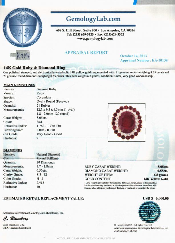 Regarding Appraised Jewelry and Loose Stones - Windsor Auction sends them out to a third party for Retail Replacement Value Appraisals, which are the most common. These types of evaluations are written for insurance needs. This would be the cost to replace the jewelry with an item of equal quality and kind, considered to be the current market price or the replacement value. This type of appraisal is done to protect you in the event of damage or loss of a valuable item. Our appraisals are conducted by independent 3rd Party appraisal firms that utilizes Certified GIA Gemologist. Appraisals should be used for verification of gemstone and/or metal weight, size, and grade only, not actual value. Appraisal value should be considered for insurance purposes only, not actual value, as price varies greatly from retail locations thru out the world. Items should not be purchased with the expectation to resell for appraisal price, or for profit.
