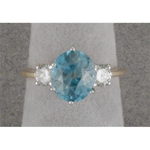 This is a stunner! 14K white and yellow gold ring is set with chunky old-cut oval blue zircon which measures 7.7MM x 9.2MM and is estimated to weigh over 3 carats. It is flanked by two .20 carat modern-cut diamonds. It is a size 6 1/2 and weighs 3.7 grams. has asked us to share the following information with you: zircon is a naturally occurring stone and has NO relationship with cubic zirconia.